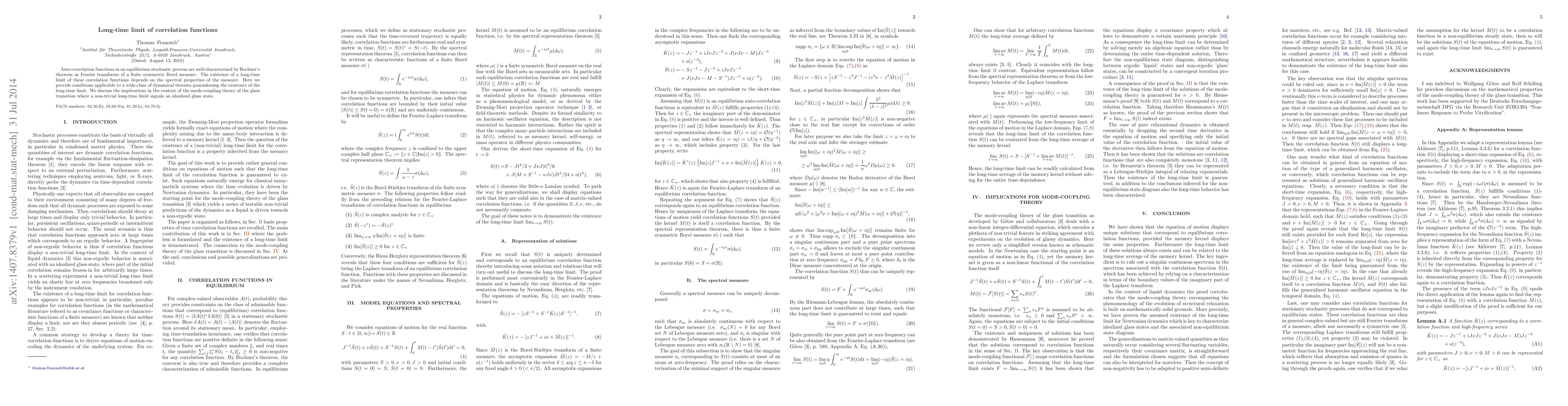 Auto-correlation functions in an equilibrium stochastic process are well-characterized by Bochner's theorem as Fourier transforms of a finite symmetric Borel measure. The existence of a long-time limit of these correlation functions depends on the spectral properties of the measure. Here we provide conditions applicable to a wide-class of dynamical theories guaranteeing the existence of the long-time limit. We discuss the implications in the context of the mode-coupling theory of the glass transition where a non-trivial long-time limit signals an idealized glass state.