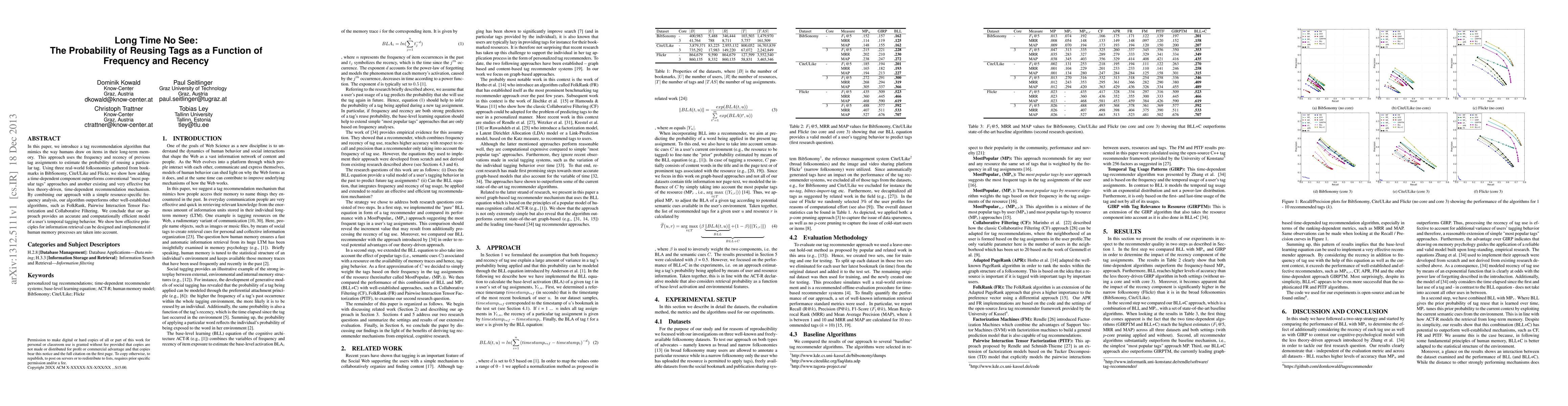 This paper proposes a tag recommendation algorithm that leverages the frequency and recency of past tag usage to predict tag reuse, outperforming conventional and other advanced recommendation methods. The approach, validated on real-world data, demonstrates improved performance by incorporating human memory principles into information retrieval.