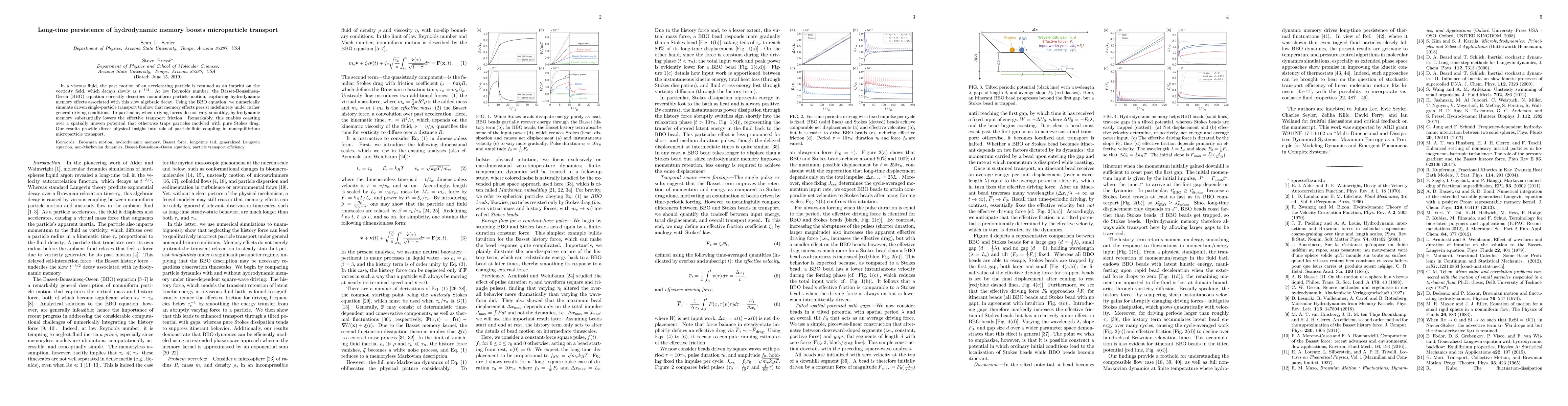 In a viscous fluid, the past motion of an accelerating particle is retained as an imprint on the vorticity field, which decays slowly as $t^{-3/2}$. At low Reynolds number, the Basset-Boussinesq-Oseen (BBO) equation correctly describes nonuniform particle motion, capturing hydrodynamic memory effects associated with this slow algebraic decay. Using the BBO equation, we numerically simulate driven single-particle transport to show that memory effects persist indefinitely under rather general driving conditions. In particular, when driving forces do not vary smoothly, hydrodynamic memory substantially lowers the effective transport friction. Remarkably, this enables coasting over a spatially uneven potential that otherwise traps particles modeled with pure Stokes drag. Our results provide direct physical insight into role of particle-fluid coupling in nonequilibrium microparticle transport.