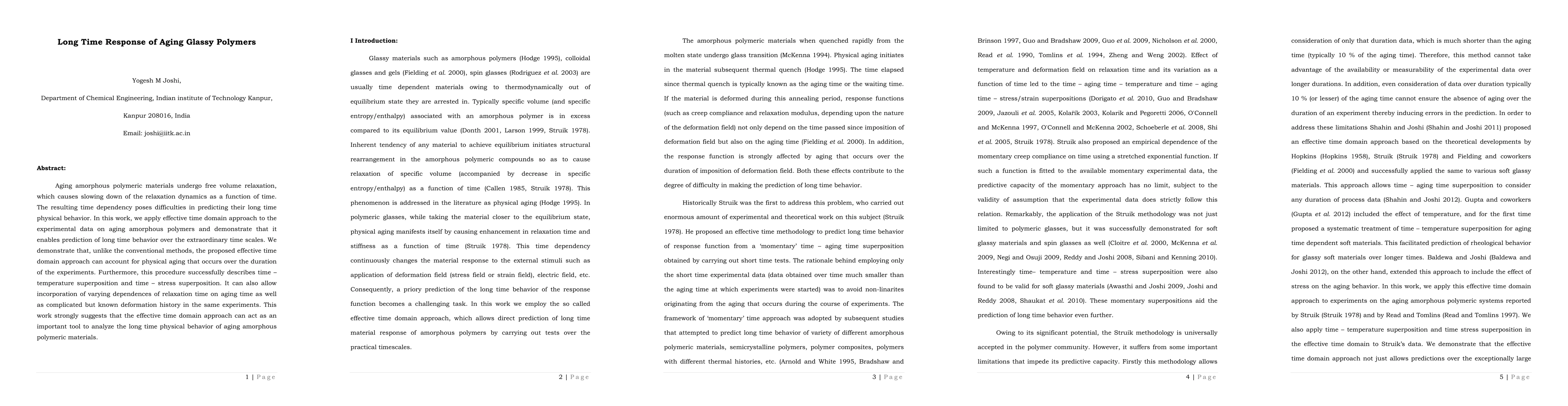 Aging amorphous polymeric materials undergo free volume relaxation, which causes slowing down of the relaxation dynamics as a function of time. The resulting time dependency poses difficulties in predicting their long time physical behavior. In this work, we apply effective time domain approach to the experimental data on aging amorphous polymers and demonstrate that it enables prediction of long time behavior over the extraordinary time scales. We demonstrate that, unlike the conventional methods, the proposed effective time domain approach can account for physical aging that occurs over the duration of the experiments. Furthermore, this procedure successfully describes time temperature superposition and time stress superposition. It can also allow incorporation of varying dependences of relaxation time on aging time as well as complicated but known deformation history in the same experiments. This work strongly suggests that the effective time domain approach can act as an important tool to analyze the long time physical behavior of aging amorphous polymeric materials. Aging amorphous polymeric materials undergo free volume relaxation, which causes slowing down of the relaxation dynamics as a function of time. The resulting time dependency poses difficulties in predicting their long time physical behavior. In this work, we apply effective time domain approach to the experimental data on aging amorphous polymers and demonstrate that it enables prediction of long time behavior over the extraordinary time scales. We demonstrate that, unlike the conventional methods, the proposed effective time domain approach can account for physical aging that occurs over the duration of the experiments. Furthermore, this procedure successfully describes time temperature superposition and time stress superposition.