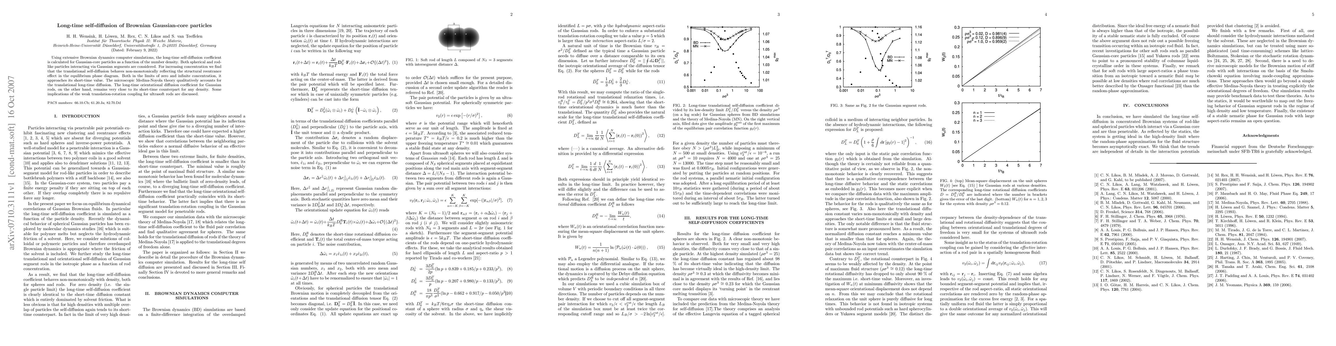 This study uses Brownian dynamics simulations to analyze long-time self-diffusion in Gaussian-core particles, finding non-monotonic behavior in translational diffusion with increasing concentration due to structural reentrance effects. The Medina-Noyola theory aligns with the observed translational long-time diffusion, while orientational diffusion remains stable across densities.