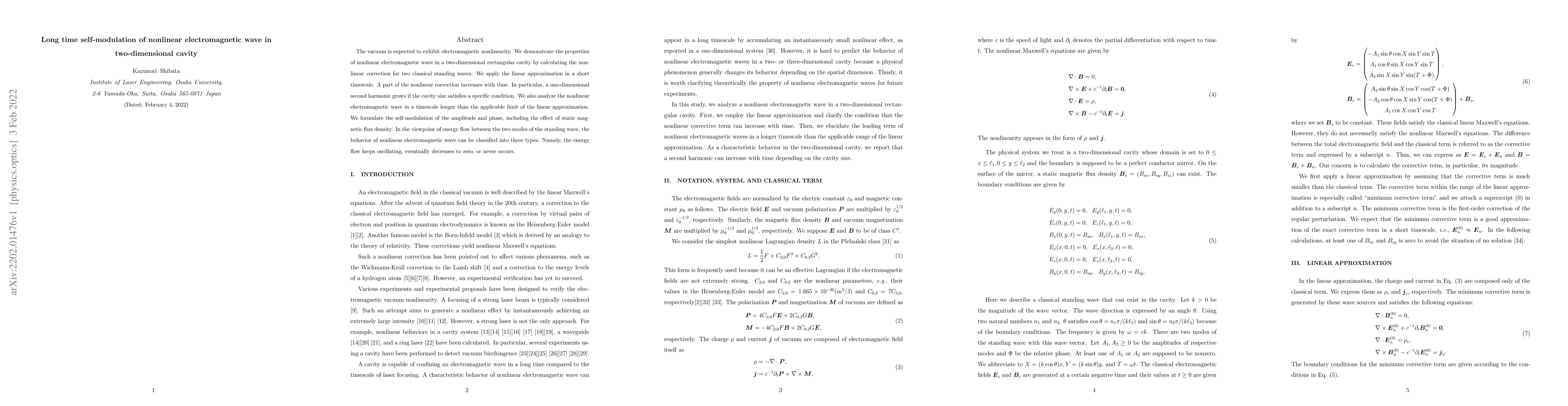 The vacuum is expected to exhibit electromagnetic nonlinearity. We demonstrate the properties of nonlinear electromagnetic wave in a two-dimensional rectangular cavity by calculating the nonlinear correction for two classical standing waves. We apply the linear approximation in a short timescale. A part of the nonlinear correction increases with time. In particular, a one-dimensional second harmonic grows if the cavity size satisfies a specific condition. We also analyze the nonlinear electromagnetic wave in a timescale longer than the applicable limit of the linear approximation. We formulate the self-modulation of the amplitude and phase, including the effect of static magnetic flux density. In the viewpoint of energy flow between the two modes of the standing wave, the behavior of nonlinear electromagnetic wave can be classified into three types. Namely, the energy flow keeps oscillating, eventually decreases to zero, or never occurs.
