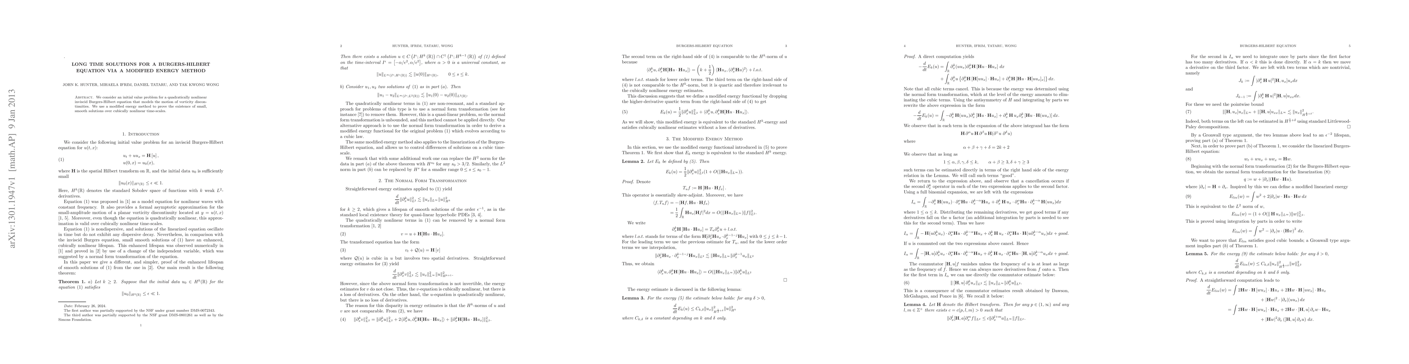 Summary: This paper investigates an initial value problem for a nonlinear Burgers-Hilbert equation using a modified energy method, proving the existence of small, smooth solutions over extended cubically nonlinear time scales. The method provides long-term solutions for modeling vorticity discontinuities.