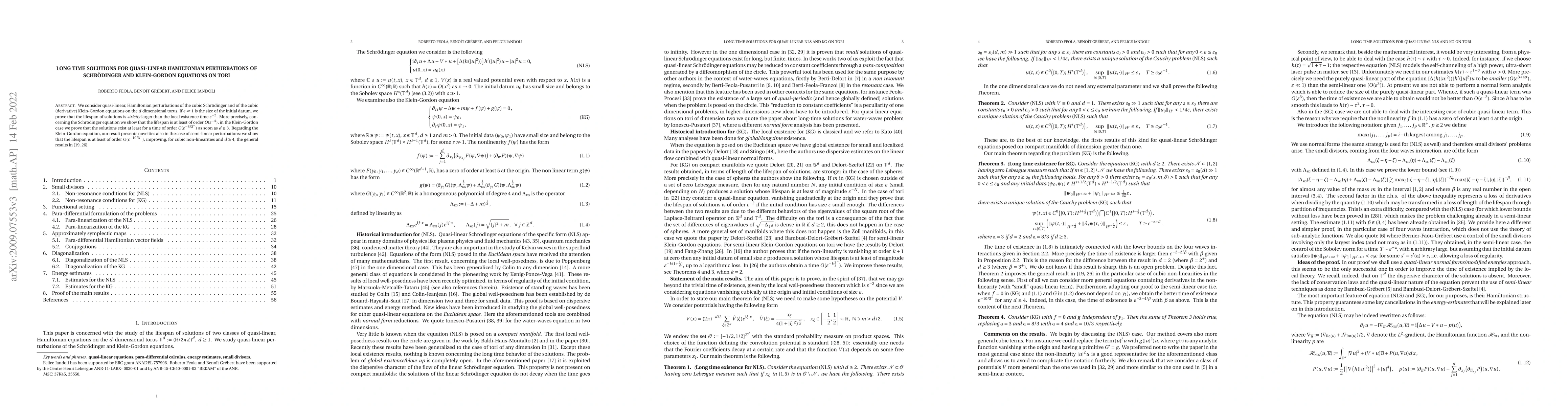 This paper investigates quasi-linear Hamiltonian perturbations of the cubic Schrödinger and cubic derivative Klein-Gordon equations on $d$-dimensional tori, proving that solution lifespans exceed the local existence time $\varepsilon^{-2}$ by showing $O(\varepsilon^{-4})$ for Schrödinger and $O(\varepsilon^{-8/3})$ for Klein-Gordon when $d \geq 3$. It also improves existing results for semi-linear Klein-Gordon perturbations, demonstrating a lifespan of at least $O(\varepsilon^{-10/3})$ for cubic non-linearities and $d \geq 4$.