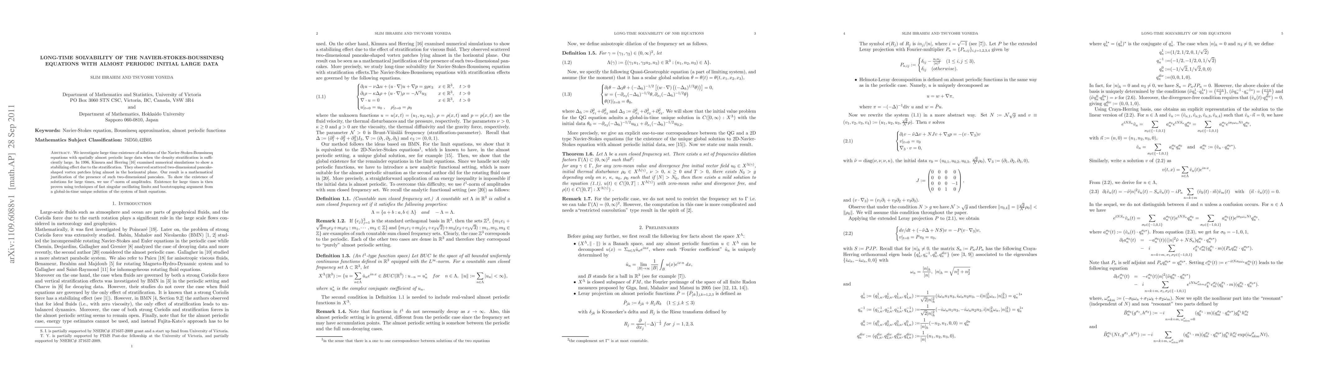 We investigate large time existence of solutions of the Navier-Stokes-Boussinesq equations with spatially almost periodic large data when the density stratification is sufficiently large. In 1996, Kimura and Herring \cite{KH} examined numerical simulations to show a stabilizing effect due to the stratification. They observed scattered two-dimensional pancake-shaped vortex patches lying almost in the horizontal plane. Our result is a mathematical justification of the presence of such two-dimensional pancakes. To show the existence of solutions for large times, we use $\ell^1$-norm of amplitudes. Existence for large times is then proven using techniques of fast singular oscillating limits and bootstrapping argument from a global-in-time unique solution of the system of limit equations.
