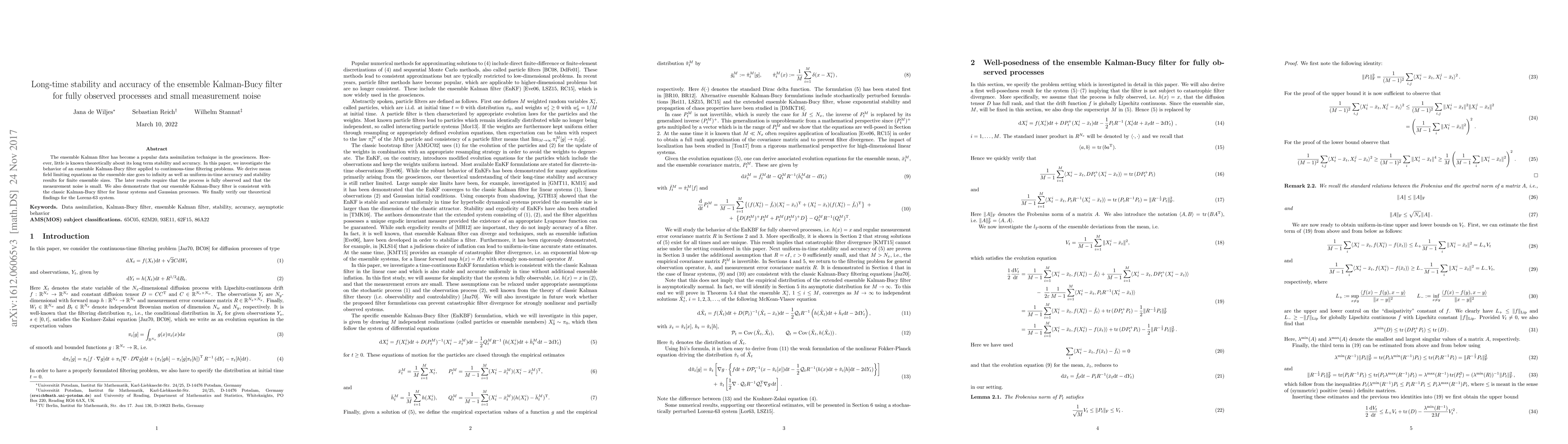 This paper investigates the long-term stability and accuracy of the ensemble Kalman-Bucy filter for fully observed processes with small measurement noise. It derives mean field limiting equations and proves uniform-in-time accuracy and stability for finite ensemble sizes, verifying the theoretical findings with the Lorenz-63 system.