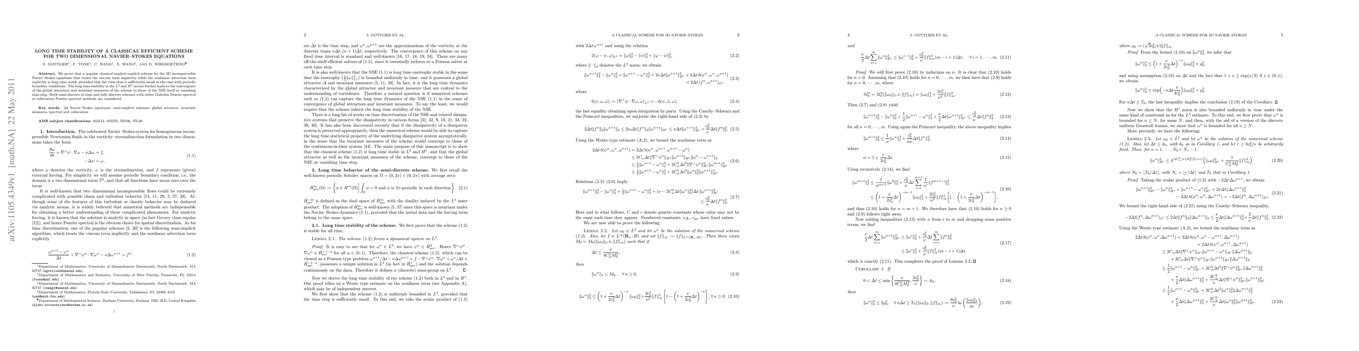 We prove that a popular classical implicit-explicit scheme for the 2D incompressible Navier--Stokes equations that treats the viscous term implicitly while the nonlinear advection term explicitly is long time stable provided that the time step is sufficiently small in the case with periodic boundary conditions. The long time stability in the $L^2$ and $H^1$ norms further leads to the convergence of the global attractors and invariant measures of the scheme to those of the NSE itself at vanishing time step. Both semi-discrete in time and fully discrete schemes with either Galerkin Fourier spectral or collocation Fourier spectral methods are considered.