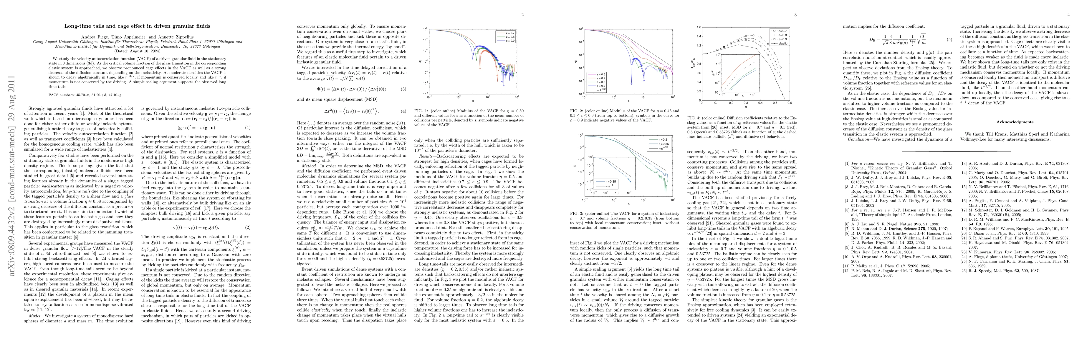 We study the velocity autocorrelation function (VACF) of a driven granular fluid in the stationary state in 3 dimensions. As the critical volume fraction of the glass transition in the corresponding elastic system is approached, we observe pronounced cage effects in the VACF as well as a strong decrease of the diffusion constant. At moderate densities the VACF is shown to decay algebraically in time (t^{-3/2}) like in a molecular fluid, as long as the driving conserves momentum locally.