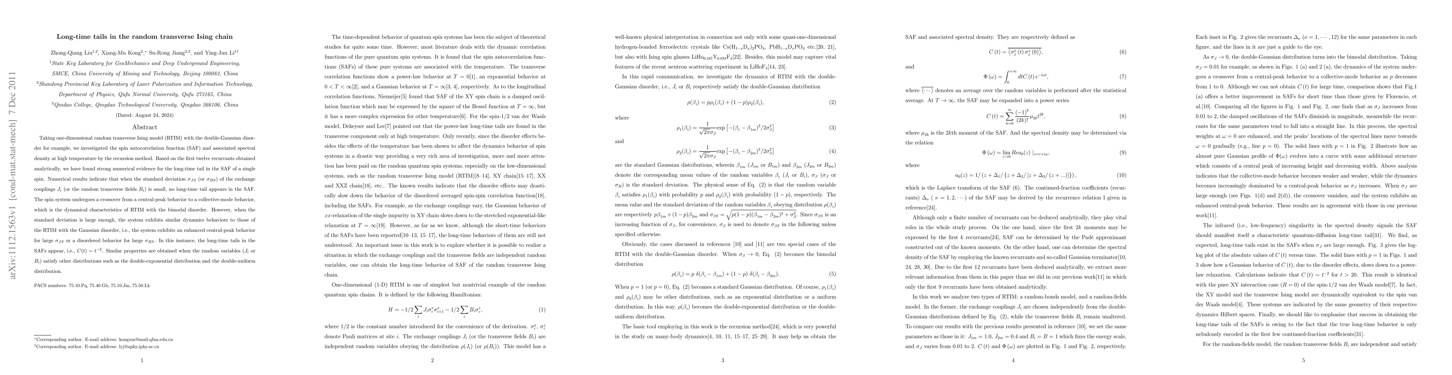 Taking one-dimensional random transverse Ising model (RTIM) with the double-Gaussian disorder for example, we investigated the spin autocorrelation function (SAF) and associated spectral density at high temperature by the recursion method. Based on the first twelve recurrants obtained analytically, we have found strong numerical evidence for the long-time tail in the SAF of a single spin. Numerical results indicate that when the standard deviation {\sigma}_{JS} (or {\sigma}_{BS}) of the exchange couplings J_{i} (or the random transverse fields B_{i}) is small, no long-time tail appears in the SAF. The spin system undergoes a crossover from a central-peak behavior to a collective-mode behavior, which is the dynamical characteristics of RTIM with the bimodal disorder. However, when the standard deviation is large enough, the system exhibits similar dynamics behaviors to those of the RTIM with the Gaussian disorder, i.e., the system exhibits an enhanced central-peak behavior for large {\sigma}_{JS} or a disordered behavior for large {\sigma}_{BS}. In this instance, the long-time tails in the SAFs appear, i.e., C(t)\simt^{-2}. Similar properties are obtained when the random variables (J_{i} or B_{i}) satisfy other distributions such as the double-exponential distribution and the double-uniform distribution.