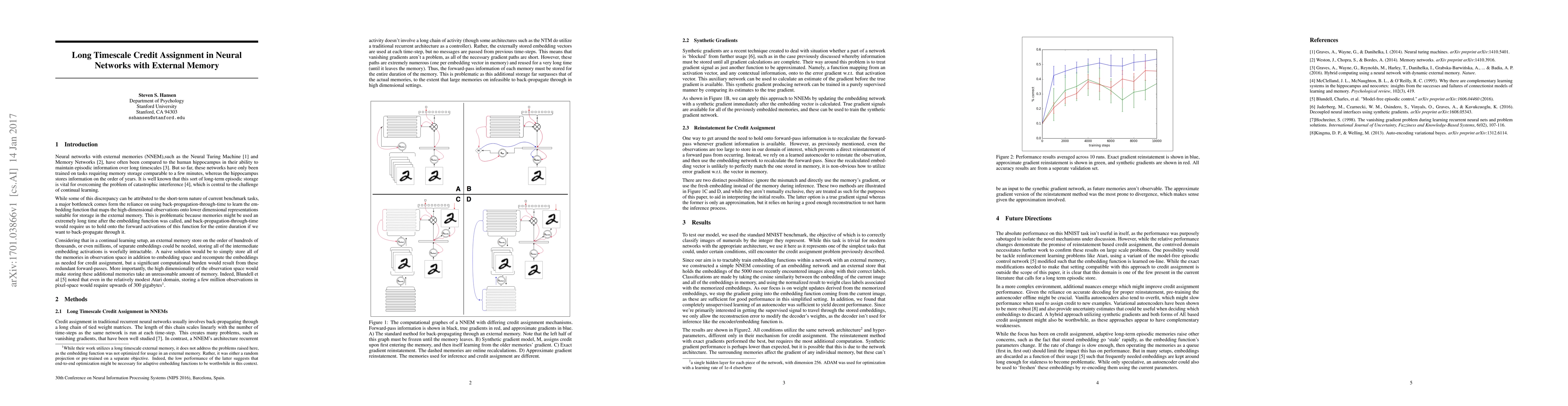 This paper proposes a solution to the long timescale credit assignment problem in neural networks with external memory, allowing for efficient backpropagation without vanishing gradients. It introduces two approximations to utilize error gradients with respect to stored embedding vectors, enabling effective learning with large memories.