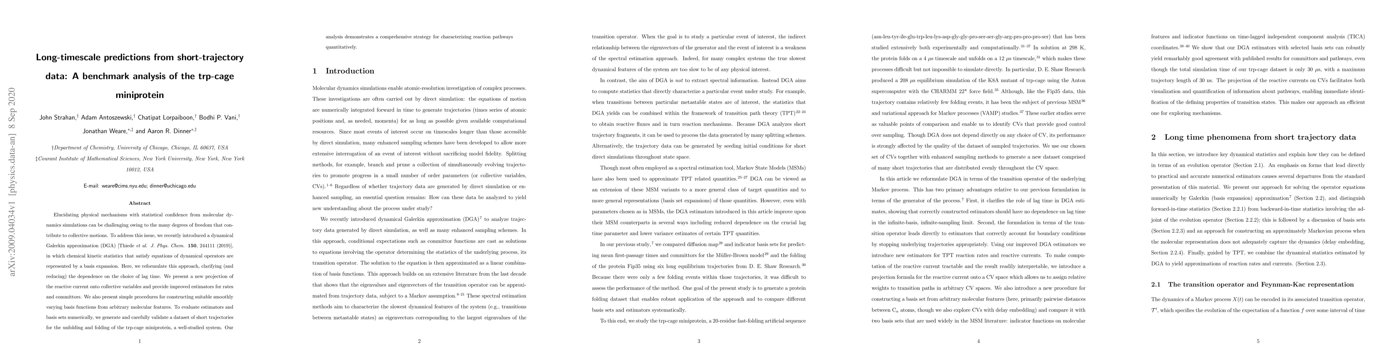 Elucidating physical mechanisms with statistical confidence from molecular dynamics simulations can be challenging owing to the many degrees of freedom that contribute to collective motions. To address this issue, we recently introduced a dynamical Galerkin approximation (DGA) [Thiede et al. J. Phys. Chem. 150, 244111 (2019)], in which chemical kinetic statistics that satisfy equations of dynamical operators are represented by a basis expansion. Here, we reformulate this approach, clarifying (and reducing) the dependence on the choice of lag time. We present a new projection of the reactive current onto collective variables and provide improved estimators for rates and committors. We also present simple procedures for constructing suitable smoothly varying basis functions from arbitrary molecular features. To evaluate estimators and basis sets numerically, we generate and carefully validate a dataset of short trajectories for the unfolding and folding of the trp-cage miniprotein, a well-studied system. Our analysis demonstrates a comprehensive strategy for characterizing reaction pathways quantitatively.