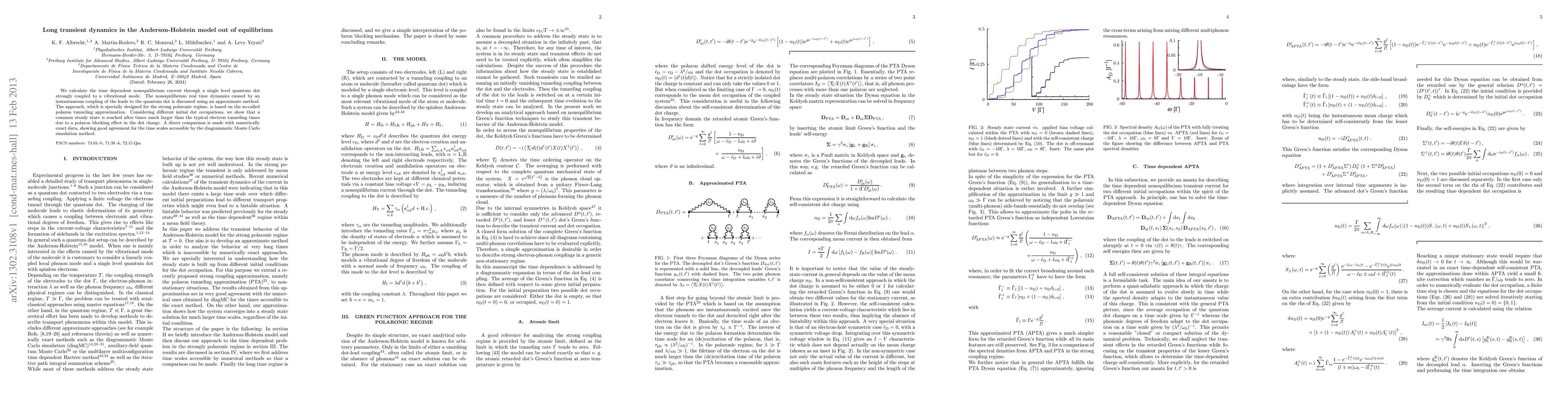 We calculate the time dependent nonequilibrium current through a single level quantum dot strongly coupled to a vibrational mode. The nonequilibrium real time dynamics caused by an instantaneous coupling of the leads to the quantum dot is discussed using an approximate method. The approach, which is specially designed for the strong polaronic regime, is based on the so-called polaron tunneling approximation. Considering different initial dot occupations, we show that a common steady state is reached after times much larger than the typical electron tunneling times due to a polaron blocking effect in the dot charge. A direct comparison is made with numerically exact data, showing good agreement for the time scales accessible by the diagrammatic Monte Carlo simulation method.
