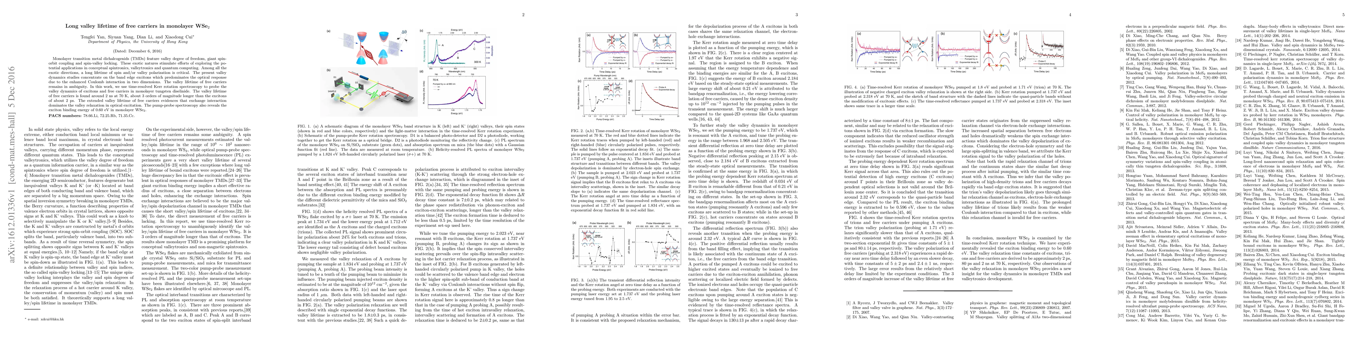 Monolayer transition metal dichalcogenids (TMDs) feature valley degree of freedom, giant spin-orbit coupling and spin-valley locking. These exotic natures stimulate efforts of exploring the potential applications in conceptual spintronics, valleytronics and quantum computing. Among all the exotic directions, a long lifetime of spin and/or valley polarization is critical. The present valley dynamics studies concentrate on the band edge excitons which predominates the optical response due to the enhanced Coulomb interaction in two dimensions. The valley lifetime of free carriers remains in ambiguity. In this work, we use time-resolved Kerr rotation spectroscopy to probe the valley dynamics of excitons and free carriers in monolayer tungsten diselinide. The valley lifetime of free carriers is found around 2 ns at 70 K, about 3 orders of magnitude longer than the excitons of about 2 ps. The extended valley lifetime of free carriers evidences that exchange interaction dominates the valley relaxation in optical excitation. The pump-probe spectroscopy also reveals the exciton binding energy of 0.60 eV in monolayer WSe2.