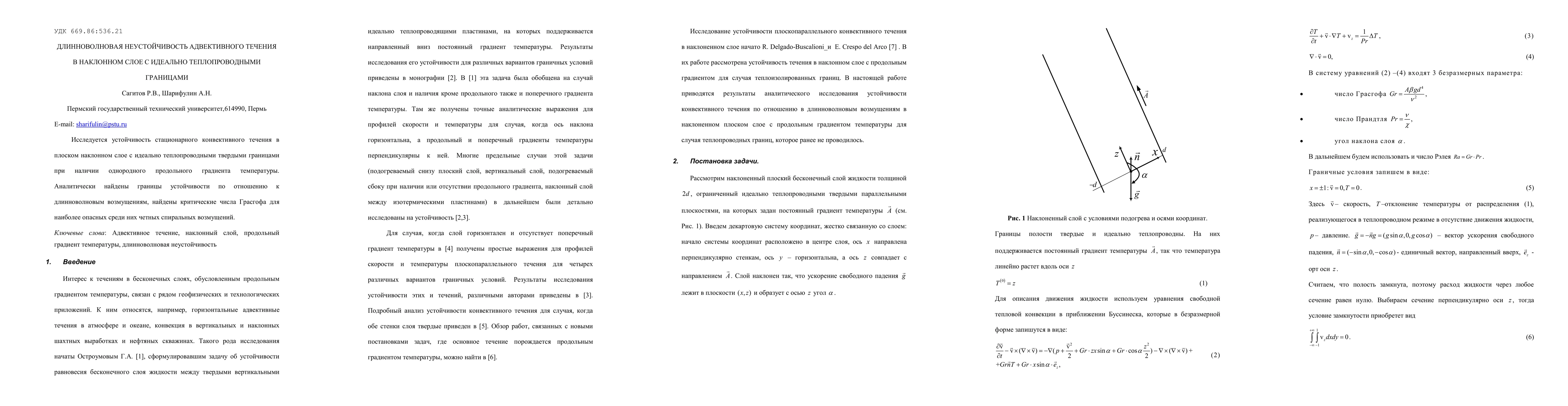 This study investigates the stability of a tilted layer with solid heat conductive boundaries under uniform longitudinal temperature gradients. It finds the critical Grashof number for the most dangerous perturbation.