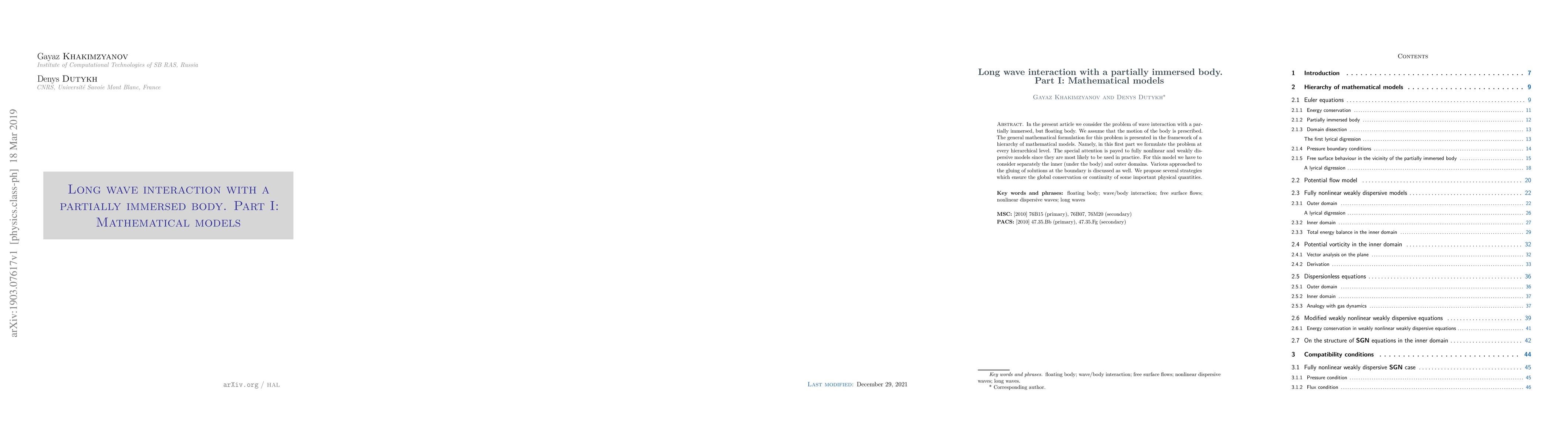 In the present article we consider the problem of wave interaction with a partially immersed, but floating body. We assume that the motion of the body is prescribed. The general mathematical formulation for this problem is presented in the framework of a hierarchy of mathematical models. Namely, in this first part we formulate the problem at every hierarchical level. The special attention is payed to fully nonlinear and weakly dispersive models since they are most likely to be used in practice. For this model we have to consider separately the inner (under the body) and outer domains. Various approached to the gluing of solutions at the boundary is discussed as well. We propose several strategies which ensure the global conservation or continuity of some important physical quantities.
