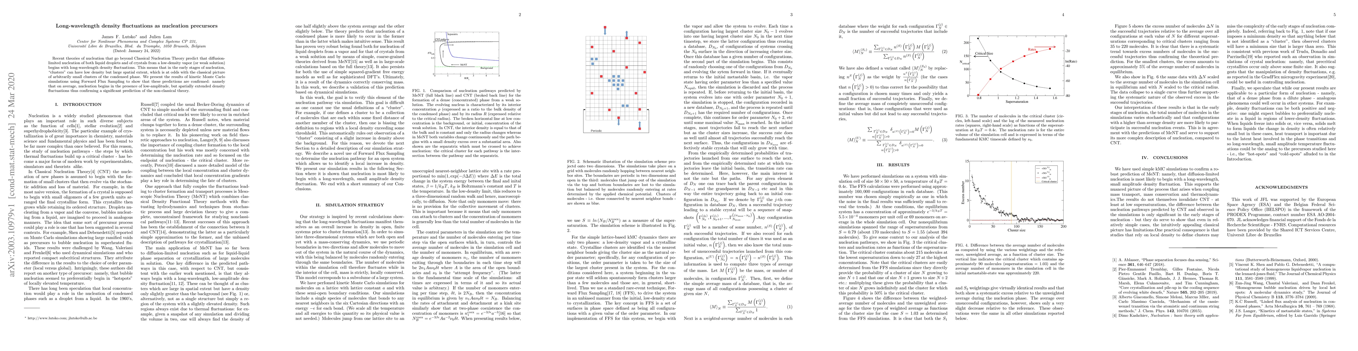 Recent theories of nucleation that go beyond Classical Nucleation Theory predict that diffusion-limited nucleation of both liquid droplets and of crystals from a low-density vapor (or weak solution) begins with long-wavelength density fluctuations. This means that in the early stages of nucleation, 'clusters' can have low density but large spatial extent, which is at odds with the classical picture of arbitrarily small clusters of the condensed phase. We present the results of kinetic Monte Carlo simulations using Forward Flux Sampling to show that these predictions are confirmed: namely that on average, nucleation begins in the presence of low-amplitude, but spatially extended density fluctuations thus confirming a significant prediction of the non-classical theory.