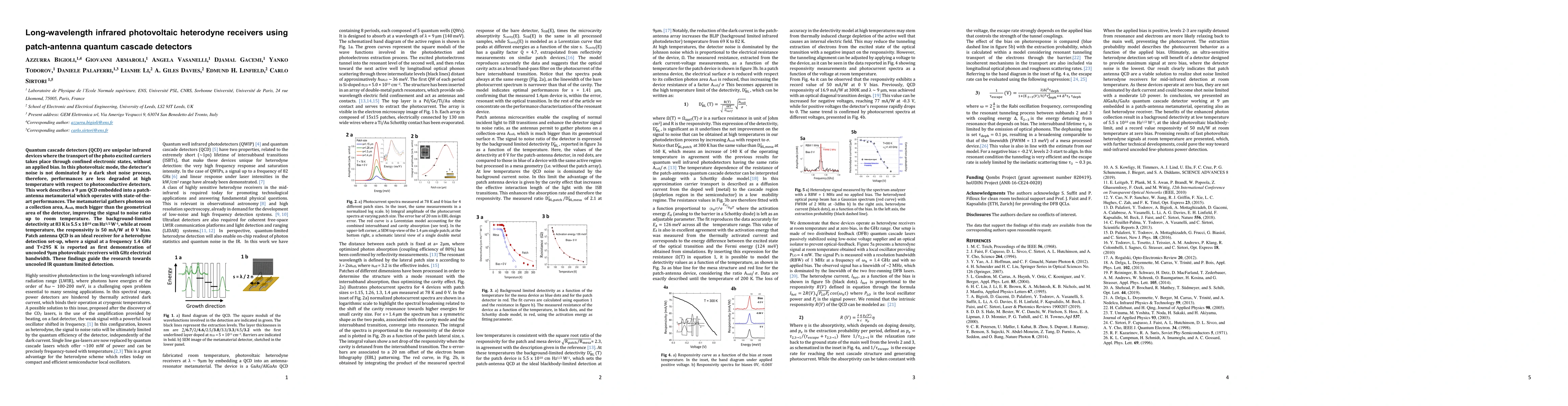 This paper presents a 9 µm quantum cascade detector (QCD) integrated into a patch-antenna metamaterial for long-wavelength infrared photovoltaic heterodyne receivers, achieving state-of-the-art performance with high responsivity and low noise at room temperature. The metamaterial enhances photon collection, demonstrating background-limited detectivity and GHz electrical bandwidth for uncooled IR detection.