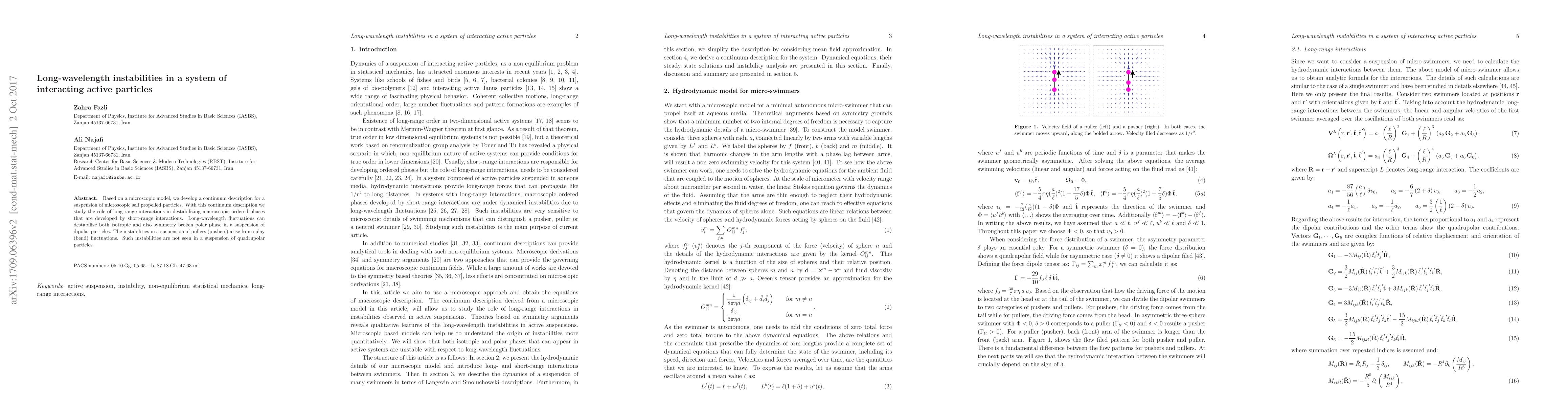 Based on a microscopic model, we develop a continuum description for a suspension of microscopic self propelled particles. With this continuum description we study the role of long-range interactions in destabilizing macroscopic ordered phases that are developed by short-range interactions. Long-wavelength fluctuations can destabilize both isotropic and also symmetry broken polar phase in a suspension of dipolar particles. The instabilities in a suspension of pullers (pushers) arise from splay (bend) fluctuations. Such instabilities are not seen in a suspension of quadrupolar particles.