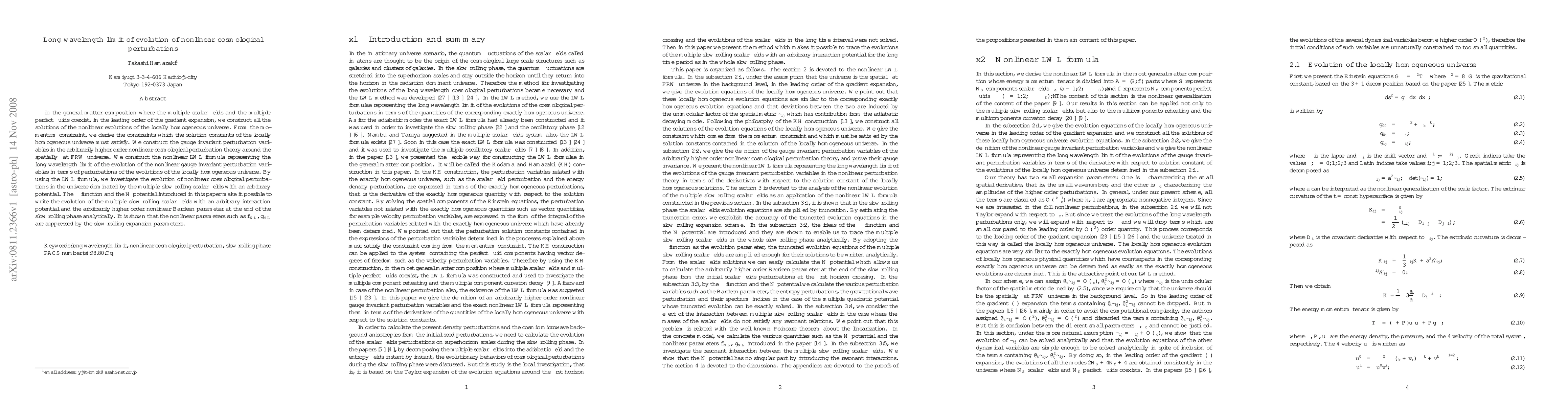 This paper constructs solutions for the nonlinear evolution of cosmological perturbations in a universe with multiple scalar fields and perfect fluids, deriving constraints for locally homogeneous universes. It introduces a long wavelength limit formula to analyze the evolution of these perturbations, revealing that nonlinear parameters like fNL and gNL are suppressed by slow rolling expansion parameters.