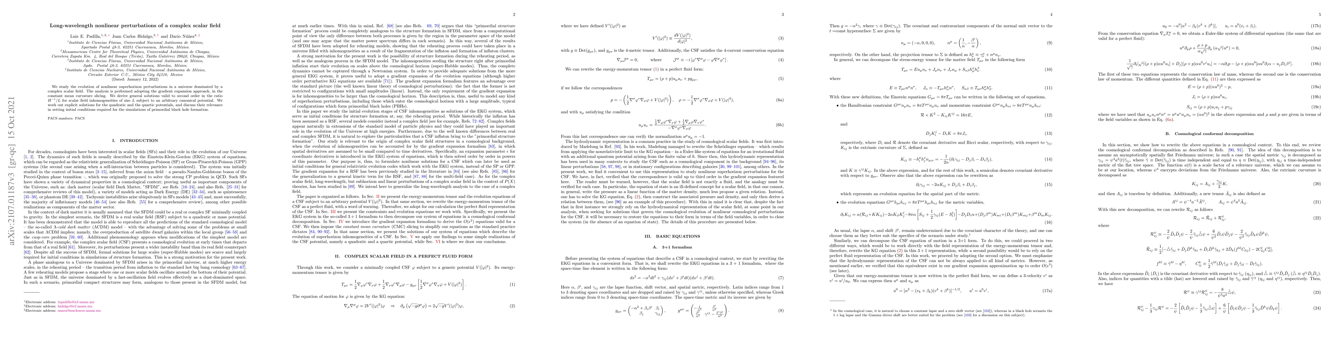 We study the evolution of nonlinear superhorizon perturbations in a universe dominated by a complex scalar field. The analysis is performed adopting the gradient expansion approach, in the constant mean curvature slicing. We derive general solutions valid to second order in the ratio $H^{-1}/L$ for scalar field inhomogeneities of size $L$ subject to an arbitrary canonical potential. We work out explicit solutions for the quadratic and the quartic potentials, and discuss their relevance in setting initial conditions required for the simulations of Primordial Black Hole formation.