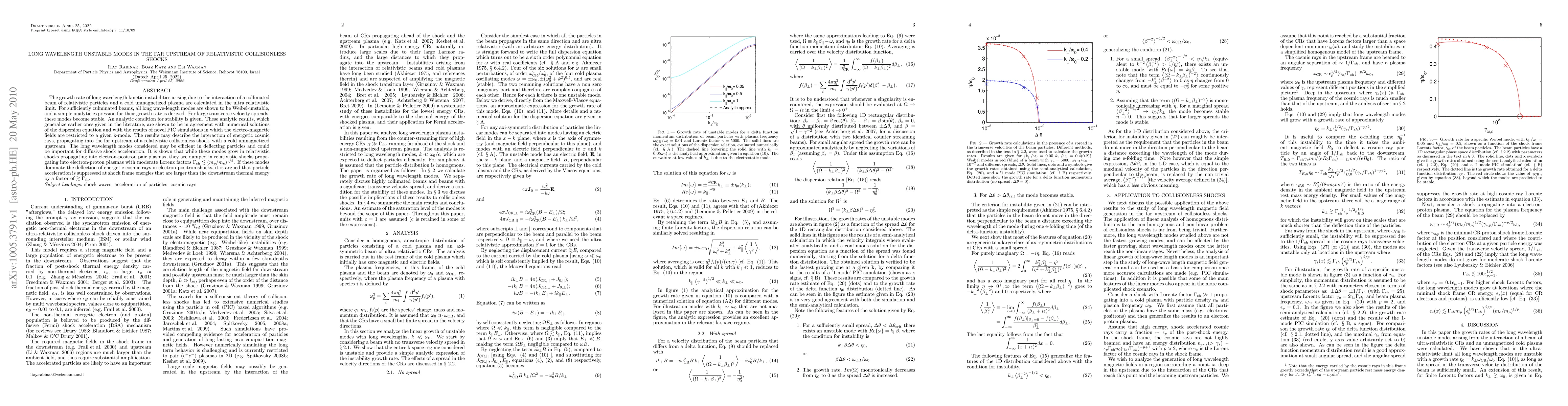 This paper calculates the growth rate of long wavelength instabilities in relativistic collisionless shocks, showing that these modes are Weibel-unstable in ultra-relativistic beams. It provides an analytic expression for their growth rate and conditions for stability, which align with numerical and simulation results.