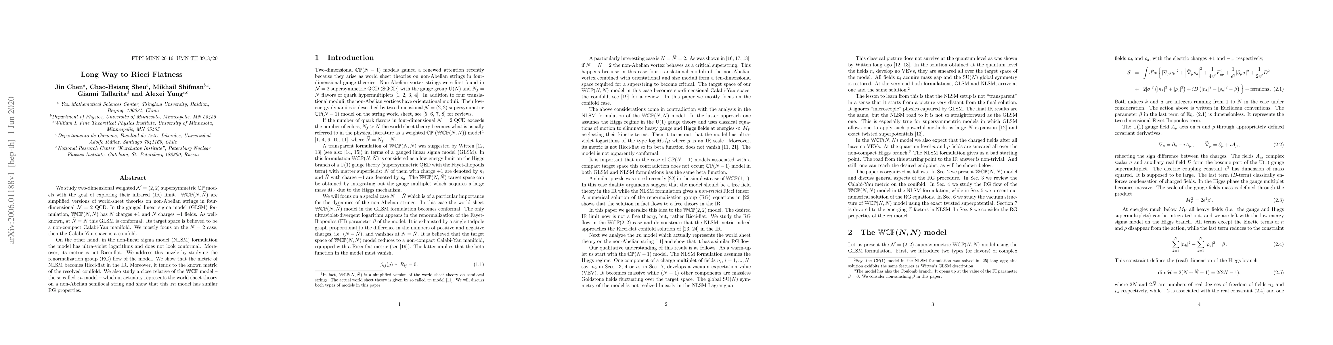 We study two-dimensional weighted ${\mathcal N}=2$ supersymmetric $\mathbb{CP}$ models with the goal of exploring their infrared (IR) limit. $\mathbb{WCP}(N,\widetilde{N})$ are simplified versions of world-sheet theories on non-Abelian strings in four-dimensional ${\mathcal N}=2$ QCD. In the gauged linear sigma model (GLSM) formulation, $\mathbb{WCP} (N,\widetilde{N})$ has $N$ charges +1 and $\widetilde{N}$ charges $-1$ fields. As well-known, at $\widetilde{N}=N$ this GLSM is conformal. Its target space is believed to be a non-compact Calabi-Yau manifold. We mostly focus on the $N=2$ case, then the Calabi-Yau space is a conifold. On the other hand, in the non-linear sigma model (NLSM) formulation the model has ultra-violet logarithms and does not look conformal. Moreover, its metric is not Ricci-flat. We address this puzzle by studying the renormalization group (RG) flow of the model. We show that the metric of NLSM becomes Ricci-flat in the IR. Moreover, it tends to the known metric of the resolved conifold. We also study a close relative of the $\mathbb{WCP}$ model -- the so called $zn$ model -- which in actuality represents the world sheet theory on a non-Abelian semilocal string and show that this $zn$ model has similar RG properties.
