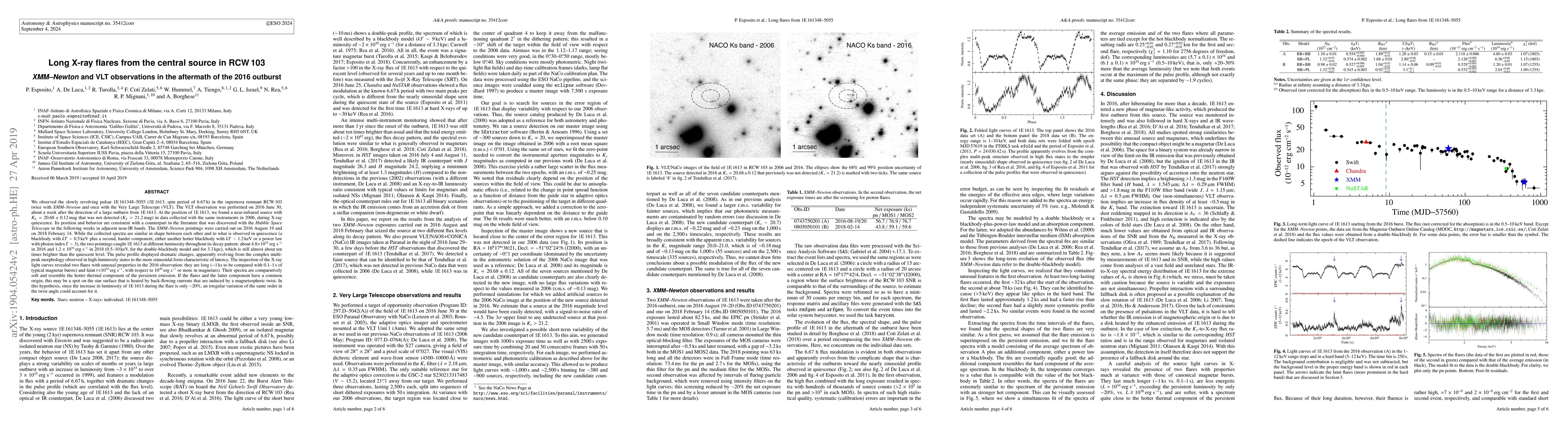 The study observed the pulsar 1E 1613 in RCW 103 with XMM-Newton and VLT, detecting near-infrared variations linked to X-ray outbursts. Unique, long (~1 ks), and faint X-ray flares were observed, differing from typical magnetar bursts, suggesting unusual emission mechanisms in this slowly revolving pulsar.