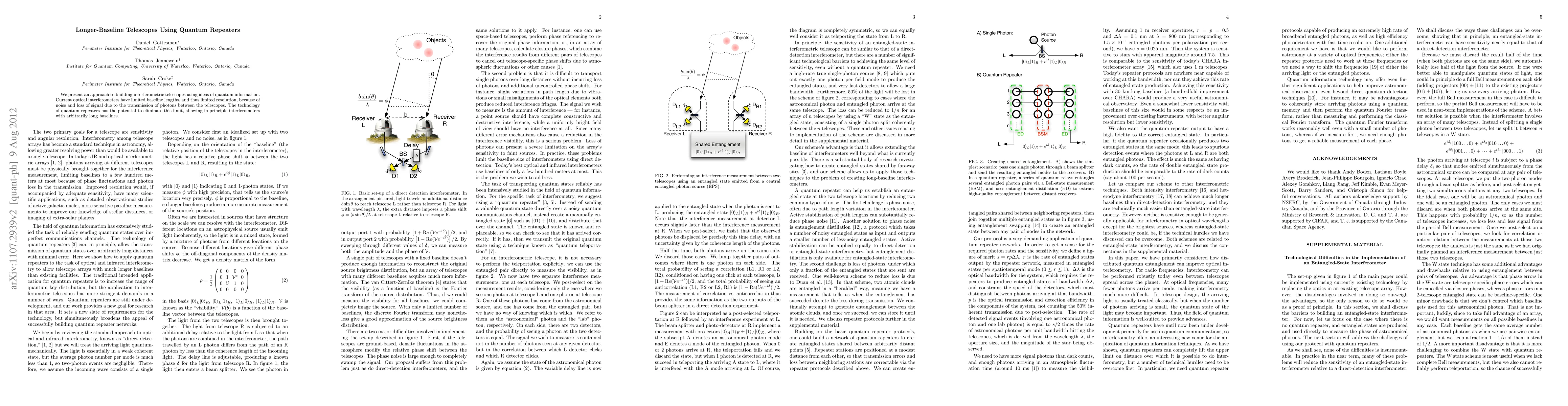 We present an approach to building interferometric telescopes using ideas of quantum information. Current optical interferometers have limited baseline lengths, and thus limited resolution, because of noise and loss of signal due to the transmission of photons between the telescopes. The technology of quantum repeaters has the potential to eliminate this limit, allowing in principle interferometers with arbitrarily long baselines.