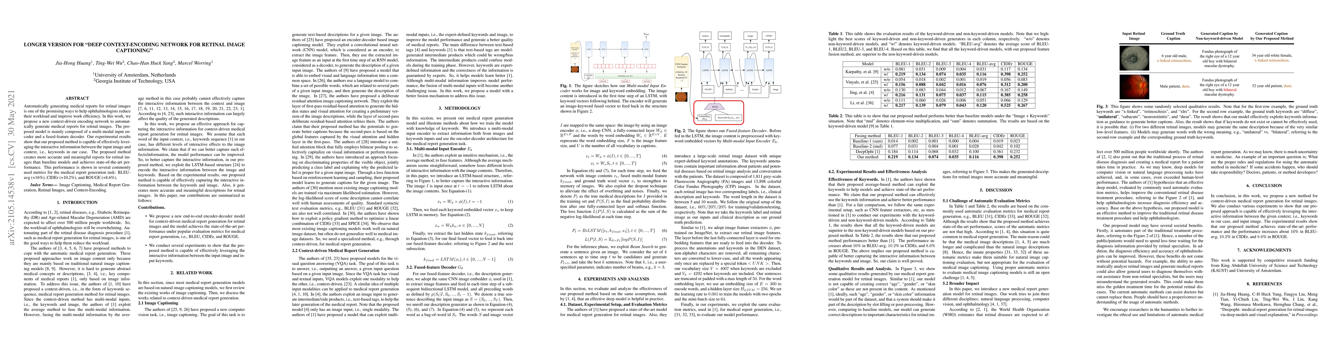 Automatically generating medical reports for retinal images is one of the promising ways to help ophthalmologists reduce their workload and improve work efficiency. In this work, we propose a new context-driven encoding network to automatically generate medical reports for retinal images. The proposed model is mainly composed of a multi-modal input encoder and a fused-feature decoder. Our experimental results show that our proposed method is capable of effectively leveraging the interactive information between the input image and context, i.e., keywords in our case. The proposed method creates more accurate and meaningful reports for retinal images than baseline models and achieves state-of-the-art performance. This performance is shown in several commonly used metrics for the medical report generation task: BLEU-avg (+16%), CIDEr (+10.2%), and ROUGE (+8.6%).