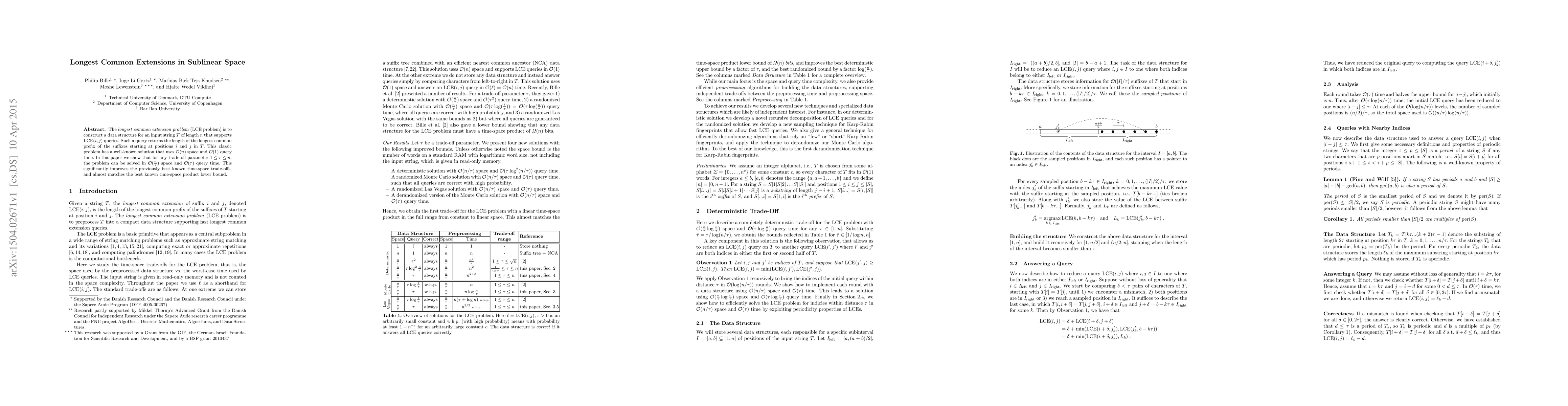 This paper presents a novel data structure for solving the longest common extension problem in sublinear space, achieving $O(\frac{n}{\tau})$ space and $O(\tau)$ query time for any trade-off parameter $1 \leq \tau \leq n$, significantly improving previous time-space trade-offs.