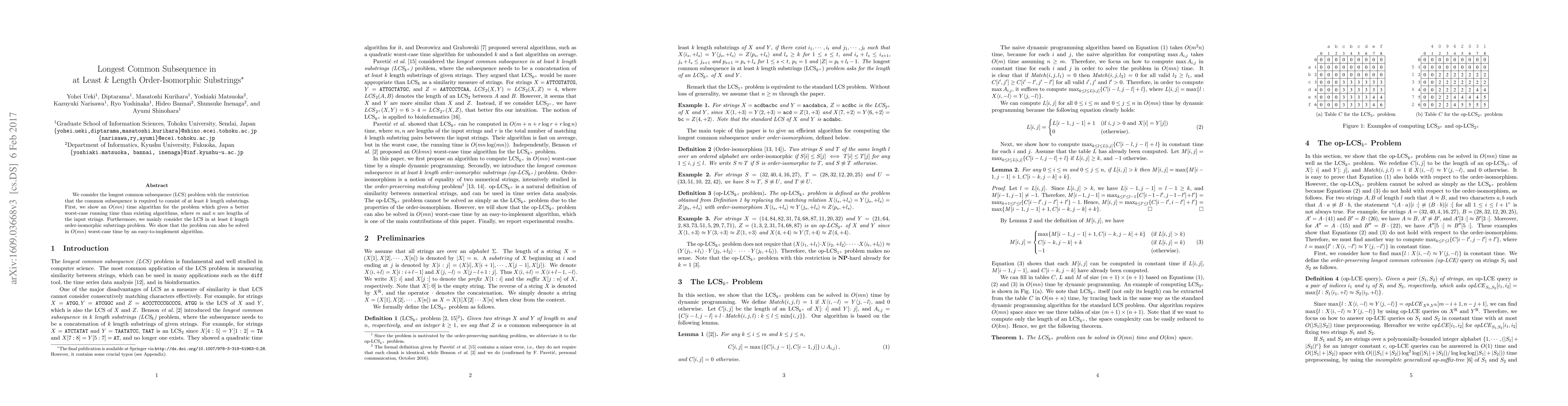 The introduction of an efficient algorithm to solve the LCS problem with the additional constraint of order-isomorphism for substrings of at least $k$ length.
