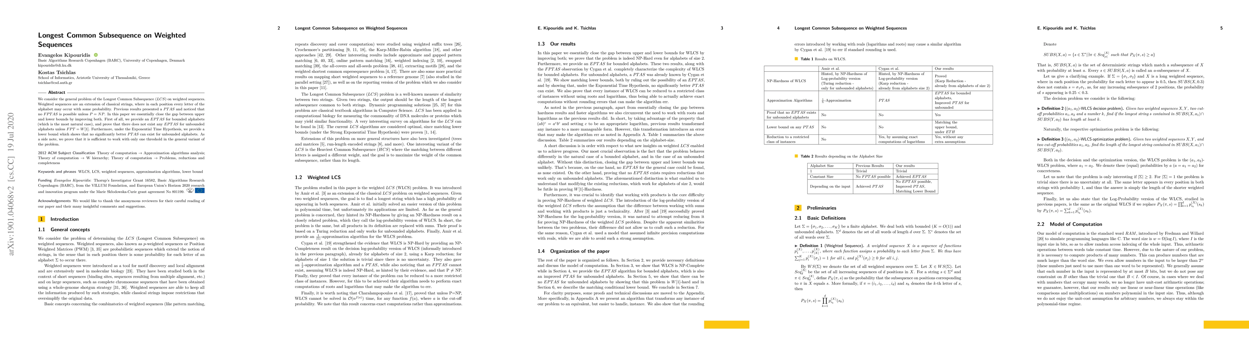 This paper improves the upper and lower bounds for the Longest Common Subsequence (LCS) on weighted sequences, offering an EPTAS for bounded alphabets while proving no EPTAS exists for unbounded alphabets unless FPT=W[1]. It also establishes a lower bound under the Exponential Time Hypothesis, indicating no significantly better PTAS can exist for unbounded alphabets.