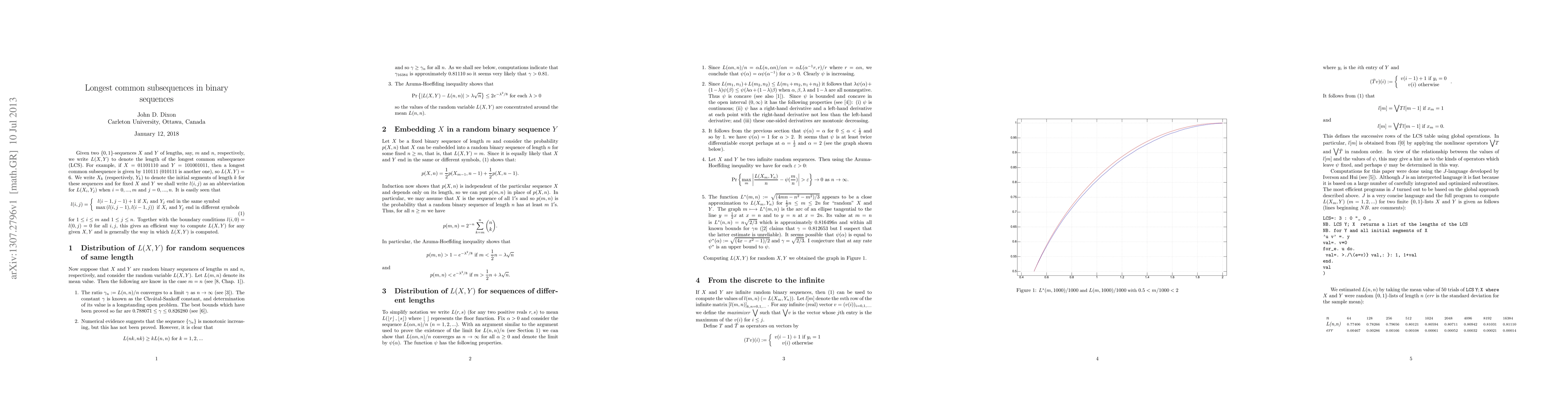Given two {0,1}-sequences X and Y of lengths m and n, respectively, we write L(X,Y) to denote the length of the longest common subsequence (LCS) of X and Y, and write L(m,n) to denote the expected value of L(X,Y) when X and Y are random sequences. We study the value of the function z -> lim L(nz,n)/n (as n -> infinity) and the relation of this function to the outstanding problem of computing the Chvatal-Sankoff constant lim L(n,n)/n.