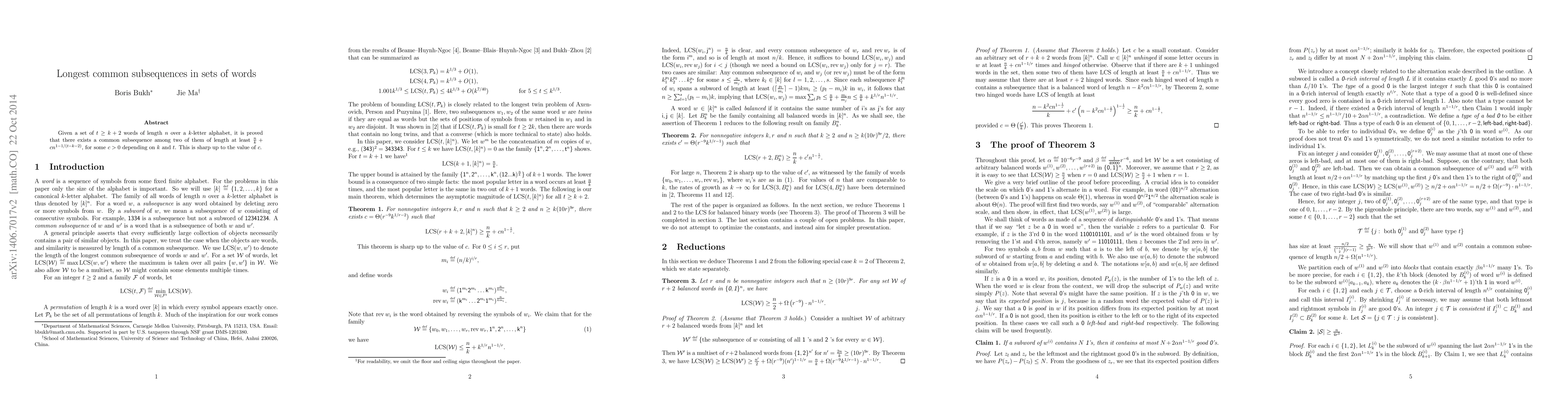 Researchers proved that there is a common subsequence of at least n/k + cn^(1-1/(t-k-2)) between two words in a set of t words, where n is the word length and k is the alphabet size.