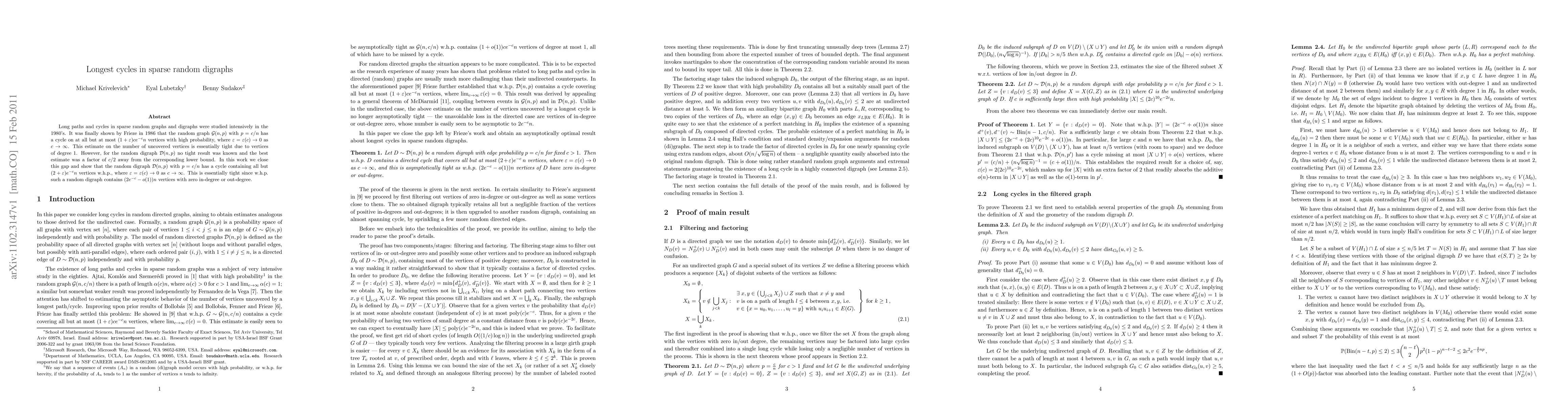 Long paths and cycles in sparse random graphs and digraphs were studied intensively in the 1980's. It was finally shown by Frieze in 1986 that the random graph $\cG(n,p)$ with $p=c/n$ has a cycle on at all but at most $(1+\epsilon)ce^{-c}n$ vertices with high probability, where $\epsilon=\epsilon(c)\to 0$ as $c\to\infty$. This estimate on the number of uncovered vertices is essentially tight due to vertices of degree 1. However, for the random digraph $\cD(n,p)$ no tight result was known and the best estimate was a factor of $c/2$ away from the corresponding lower bound. In this work we close this gap and show that the random digraph $\cD(n,p)$ with $p=c/n$ has a cycle containing all but $(2+\epsilon)e^{-c}n$ vertices w.h.p., where $\epsilon=\epsilon(c)\to 0$ as $c\to\infty$. This is essentially tight since w.h.p. such a random digraph contains $(2e^{-c}-o(1))n$ vertices with zero in-degree or out-degree.