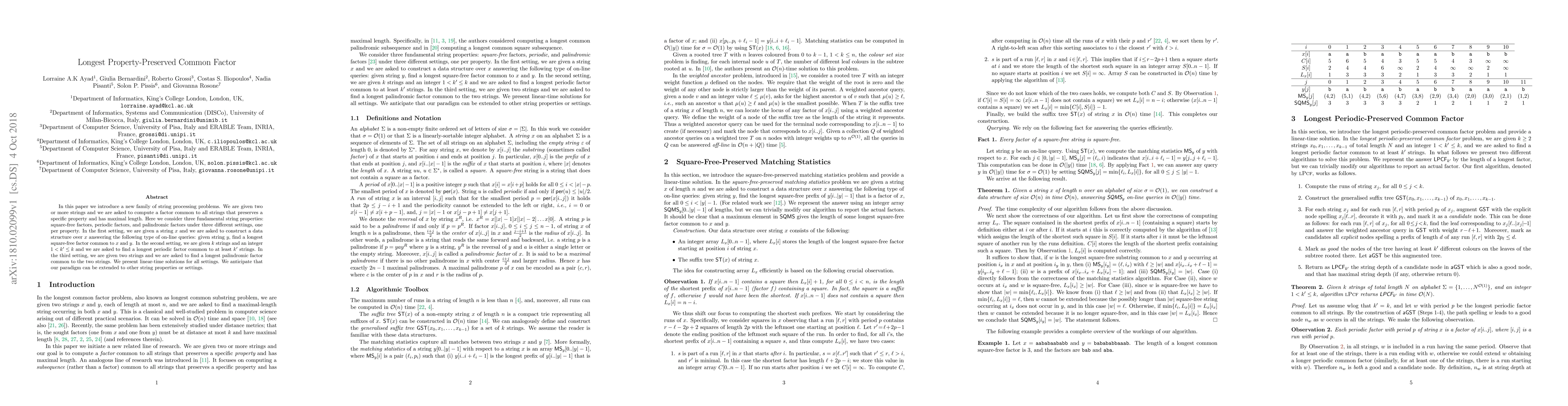 In this paper we introduce a new family of string processing problems. We are given two or more strings and we are asked to compute a factor common to all strings that preserves a specific property and has maximal length. Here we consider three fundamental string properties: square-free factors, periodic factors, and palindromic factors under three different settings, one per property. In the first setting, we are given a string $x$ and we are asked to construct a data structure over $x$ answering the following type of on-line queries: given string $y$, find a longest square-free factor common to $x$ and $y$. In the second setting, we are given $k$ strings and an integer $1 < k'\leq k$ and we are asked to find a longest periodic factor common to at least $k'$ strings. In the third setting, we are given two strings and we are asked to find a longest palindromic factor common to the two strings. We present linear-time solutions for all settings. We anticipate that our paradigm can be extended to other string properties or settings.