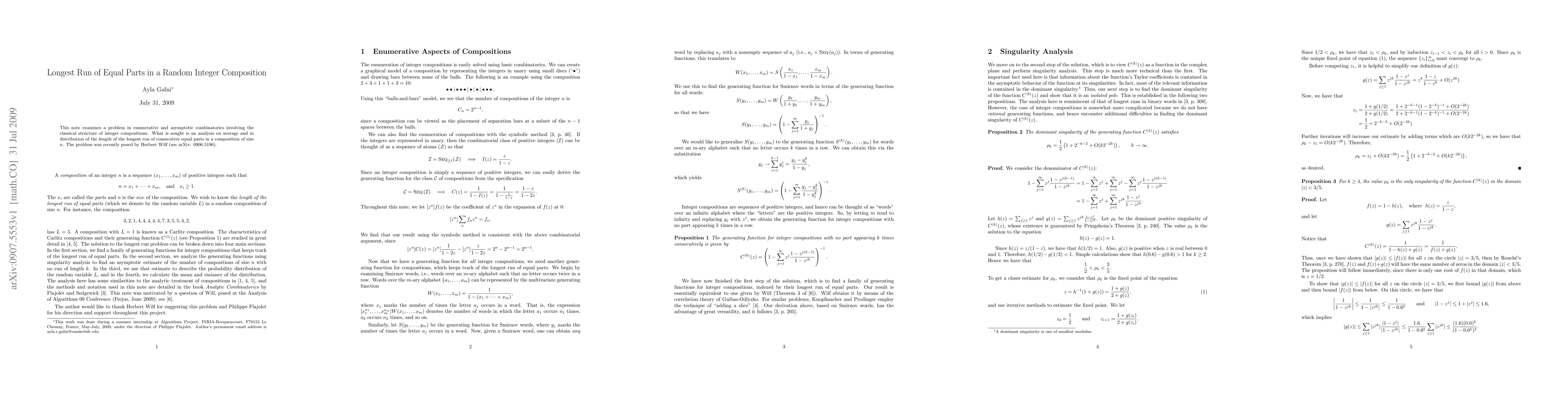 The paper analyzes the length of the longest run of consecutive equal parts in a random integer composition of size n. It finds that this length has an average value of 0.25n and follows a specific distribution.