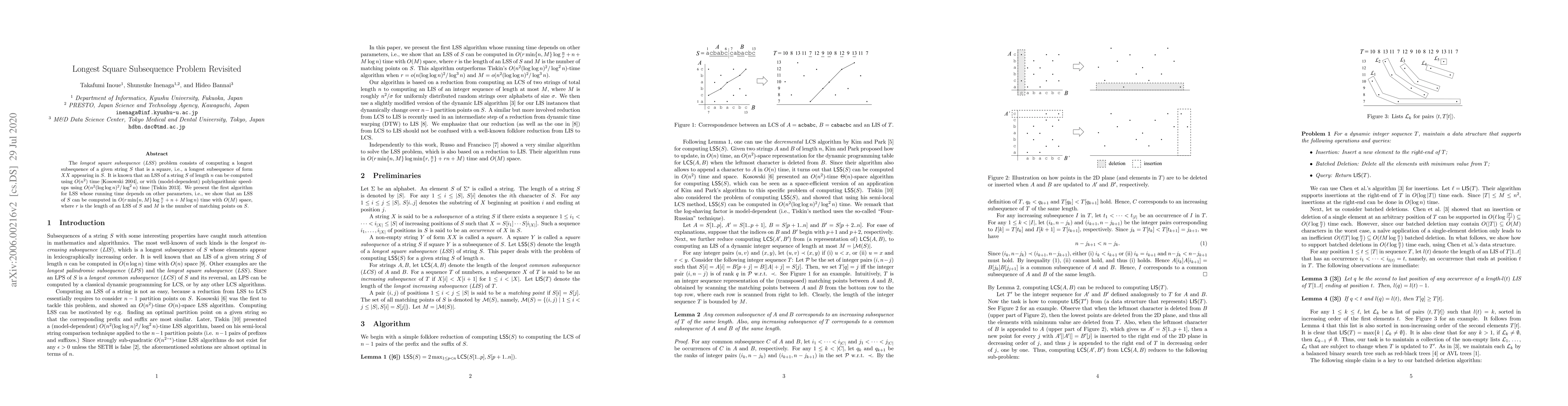 This paper presents an improved algorithm for the longest square subsequence (LSS) problem, achieving a running time of $O(r \min\{n, M\}\log \frac{n}{r} + n + M \log n)$ time with $O(M)$ space, where $r$ is the length of the LSS and $M$ is the number of matching points. This approach provides a dependency on additional parameters beyond just the string length $n$.