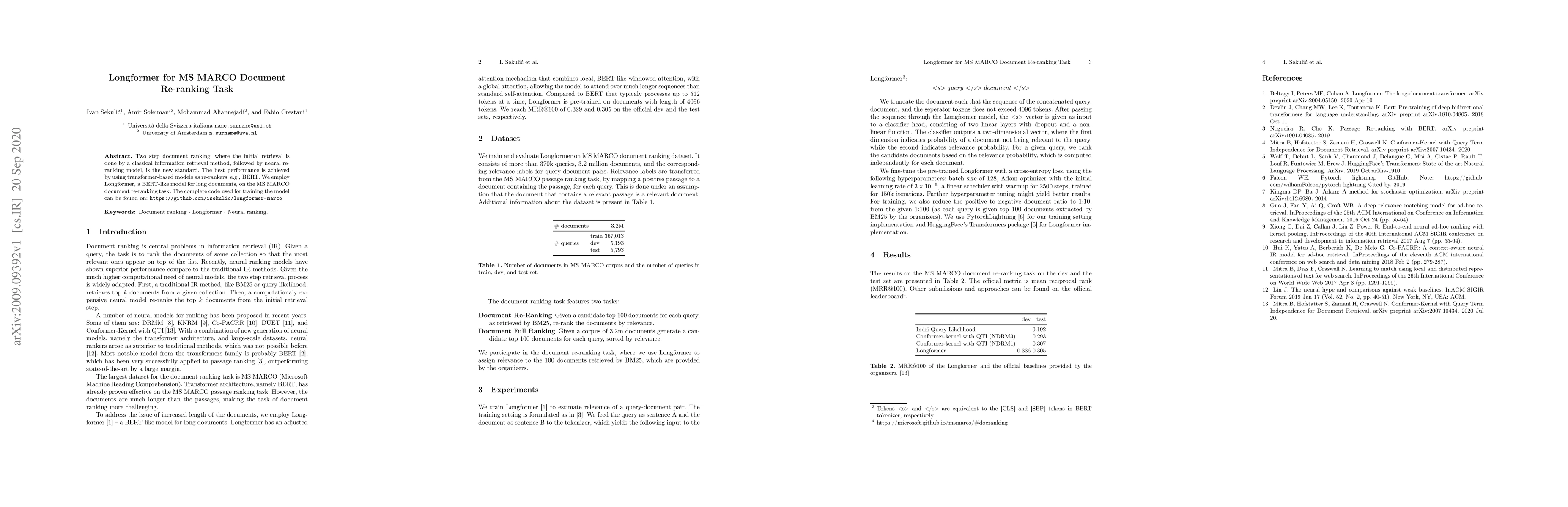 This paper explores the use of Longformer, a transformer-based model similar to BERT, for re-ranking documents in the MS MARCO task, following initial retrieval by classical methods. The results indicate that Longformer can achieve competitive performance in handling long documents, as demonstrated by the provided code on GitHub.