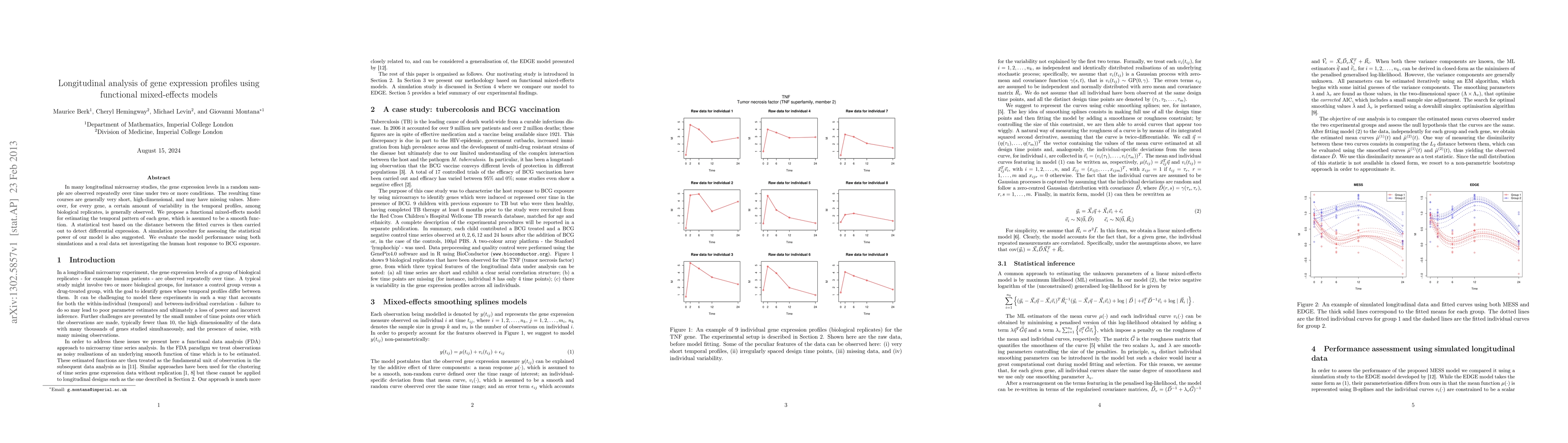This paper proposes a functional mixed-effects model to estimate temporal gene expression patterns in longitudinal microarray studies, accounting for variability among biological replicates. The model is evaluated for its ability to detect differential expression and its statistical power through simulations and a real data set on human response to BCG exposure.