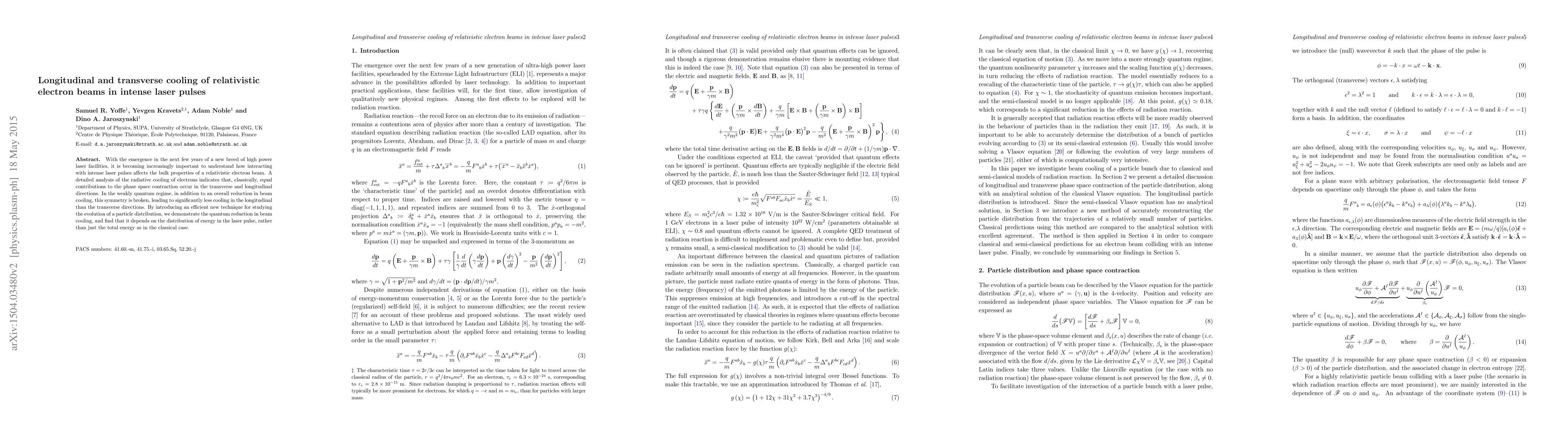 This paper investigates the cooling effects of relativistic electron beams interacting with intense laser pulses, revealing that quantum effects break the classical symmetry of equal transverse and longitudinal cooling, leading to less longitudinal cooling. The study introduces a new technique to demonstrate this quantum reduction, which depends on the laser pulse's energy distribution.