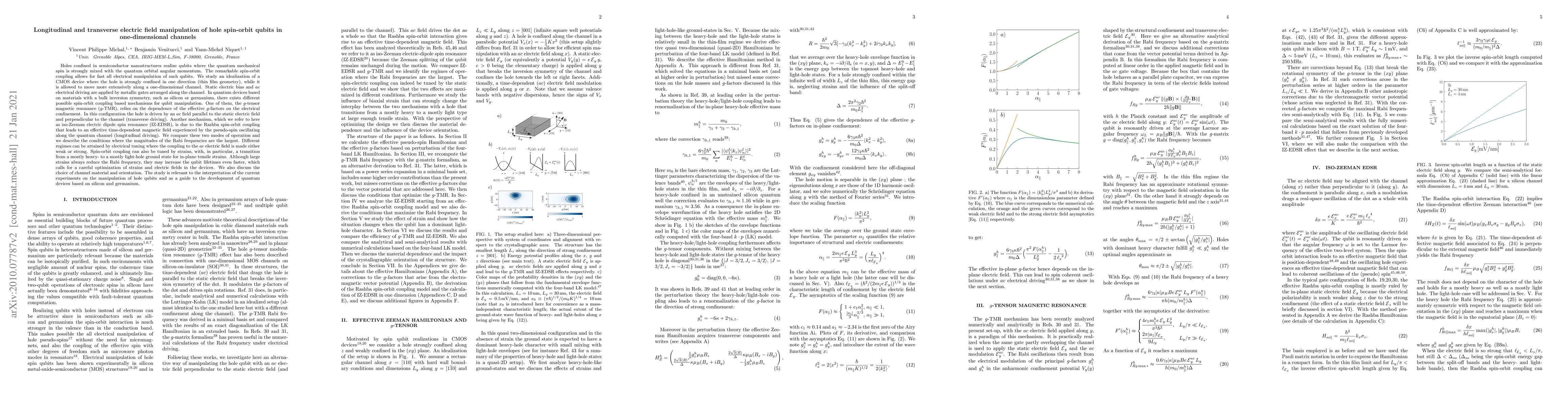 Holes confined in semiconductor nanostructures realize qubits where the quantum mechanical spin is strongly mixed with the quantum orbital angular momentum. The remarkable spin-orbit coupling allows for fast all electrical manipulation of such qubits. We study an idealization of a CMOS device where the hole is strongly confined in one direction (thin film geometry), while it is allowed to move more extensively along a one-dimensional channel. Static electric bias and $ac$ electrical driving are applied by metallic gates arranged along the channel. In quantum devices based on materials with a bulk inversion symmetry, such as silicon or germanium, there exists different possible spin-orbit coupling based mechanisms for qubit manipulation. One of them, the $g$-tensor magnetic resonance ($g$-TMR), relies on the dependence of the effective $g$-factors on the electrical confinement. In this configuration the hole is driven by an $ac$ field parallel to the static electric field and perpendicular to the channel (transverse driving). Another mechanism, which we refer to here as iso-Zeeman electric dipole spin resonance (IZ-EDSR), is due to the Rashba spin-orbit coupling that leads to an effective time-dependent magnetic field experienced by the pseudo-spin oscillating along the quantum channel (longitudinal driving). We compare these two modes of operation and we describe the conditions where the magnitudes of the Rabi frequencies are the largest. Different regimes can be attained by electrical tuning where the coupling to the $ac$ electric field is made either weak or strong...
