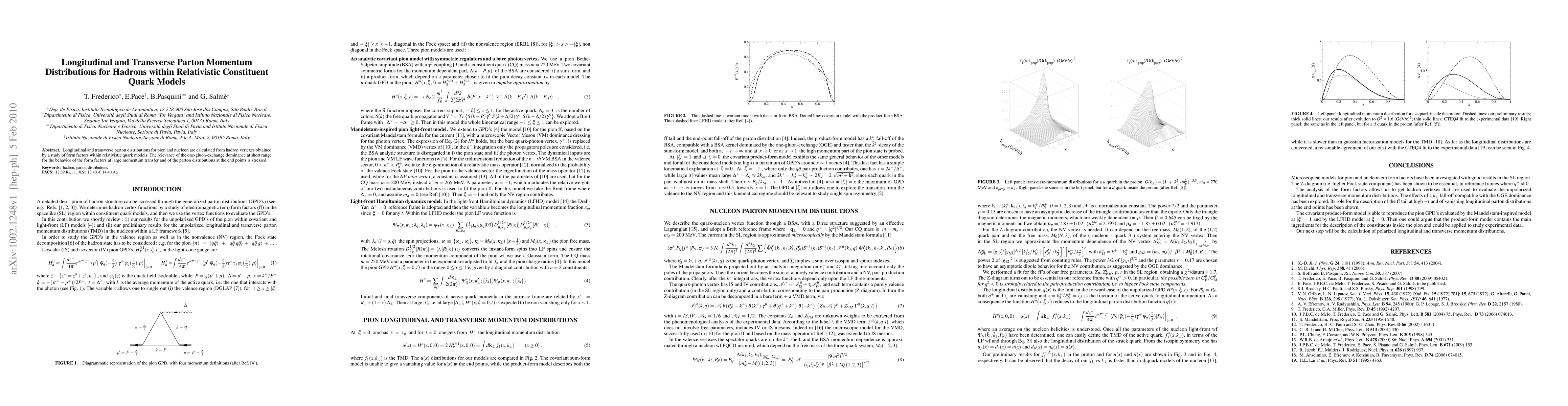 This paper calculates longitudinal and transverse parton distributions for pions and nucleons using relativistic constituent quark models, emphasizing the role of one-gluon-exchange dominance in shaping form factors at high momentum transfer and parton distributions at their endpoints.