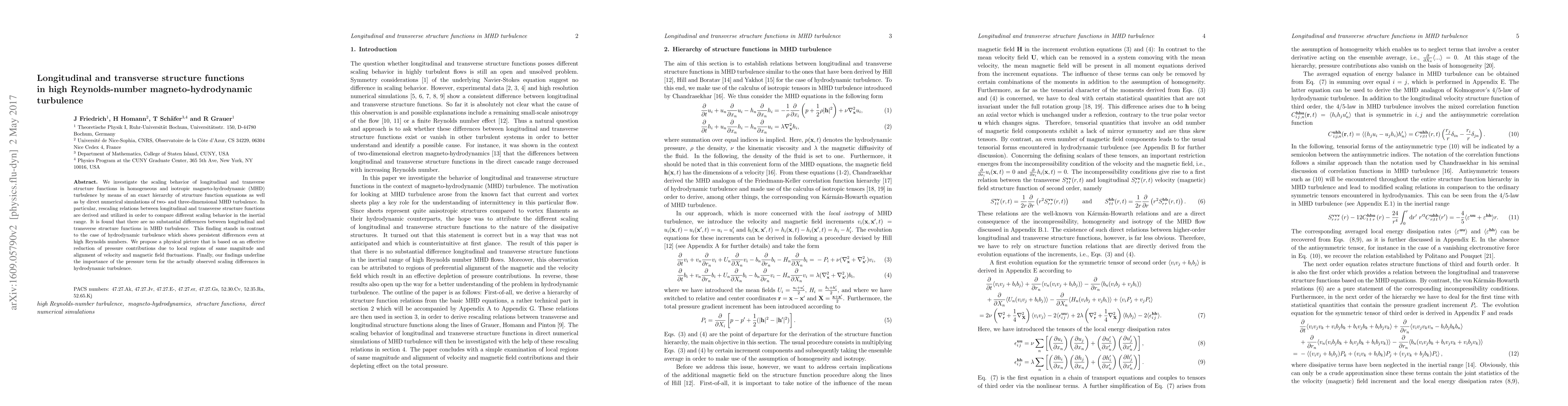 We investigate the scaling behavior of longitudinal and transverse structure functions in homogeneous and isotropic magneto-hydrodynamic (MHD) turbulence by means of an exact hierarchy of structure function equations as well as by direct numerical simulations of two- and three-dimensional MHD turbulence. In particular, rescaling relations between longitudinal and transverse structure functions are derived and utilized in order to compare different scaling behavior in the inertial range. It is found that there are no substantial differences between longitudinal and transverse structure functions in MHD turbulence. This finding stands in contrast to the case of hydrodynamic turbulence which shows persistent differences even at high Reynolds numbers. We propose a physical picture that is based on an effective reduction of pressure contributions due to local regions of same magnitude and alignment of velocity and magnetic field fluctuations. Finally, our findings underline the importance of the pressure term for the actually observed scaling differences in hydrodynamic turbulence.