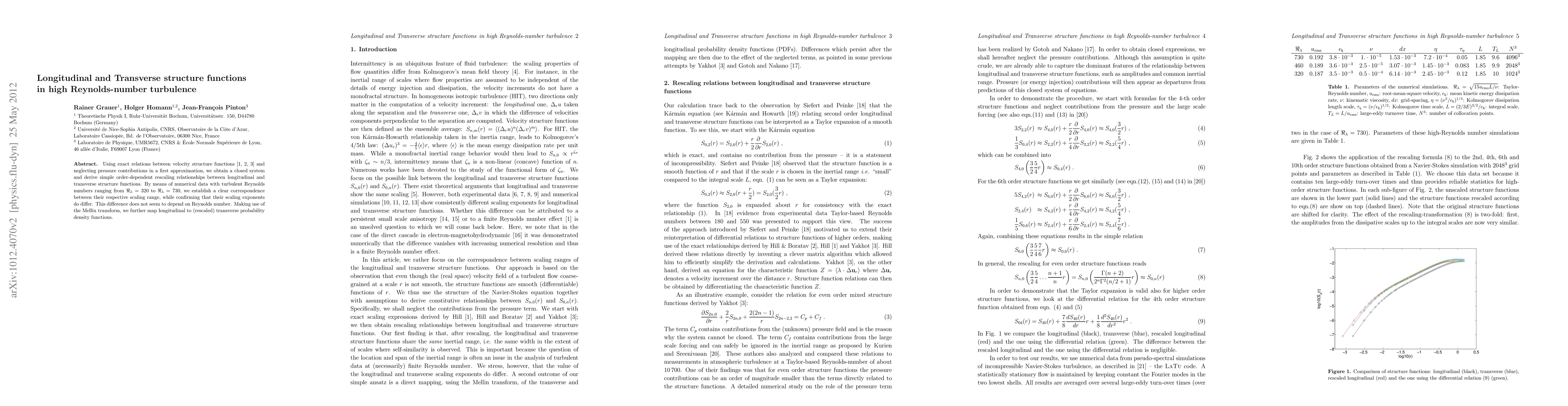 This paper derives order-dependent rescaling relationships between longitudinal and transverse structure functions in high Reynolds-number turbulence, confirming differing scaling exponents that do not depend on Reynolds number. Numerical data supports these findings and uses the Mellin transform to relate longitudinal to rescaled transverse probability density functions.