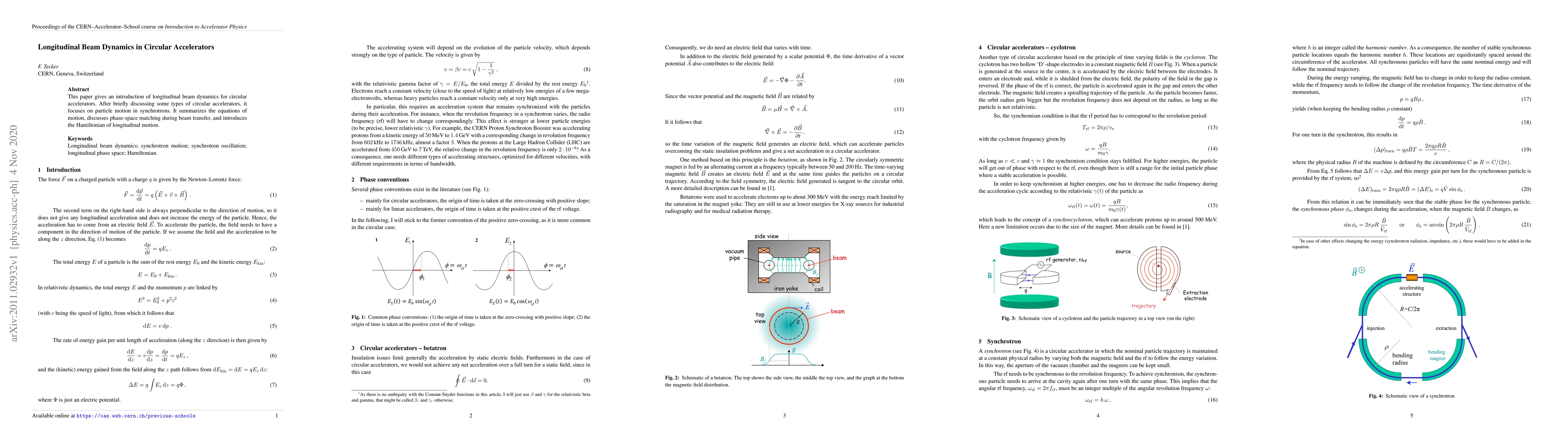 This paper introduces longitudinal beam dynamics in circular accelerators, focusing on synchrotrons, and covers the equations of motion, phase-space matching during beam transfer, and the Hamiltonian of longitudinal motion.