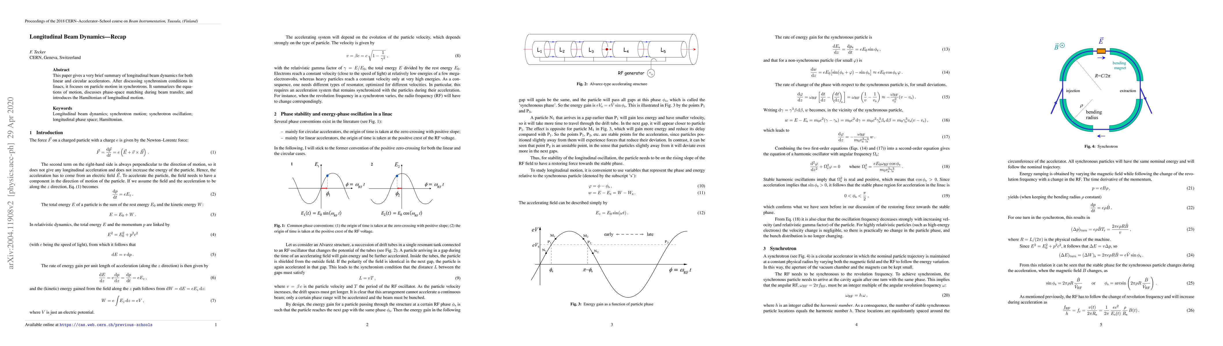 This paper succinctly recaps longitudinal beam dynamics in linear and circular accelerators, emphasizing synchronism conditions in linacs and detailing particle motion in synchrotrons, including equations of motion, phase-space matching, and the Hamiltonian of longitudinal motion.