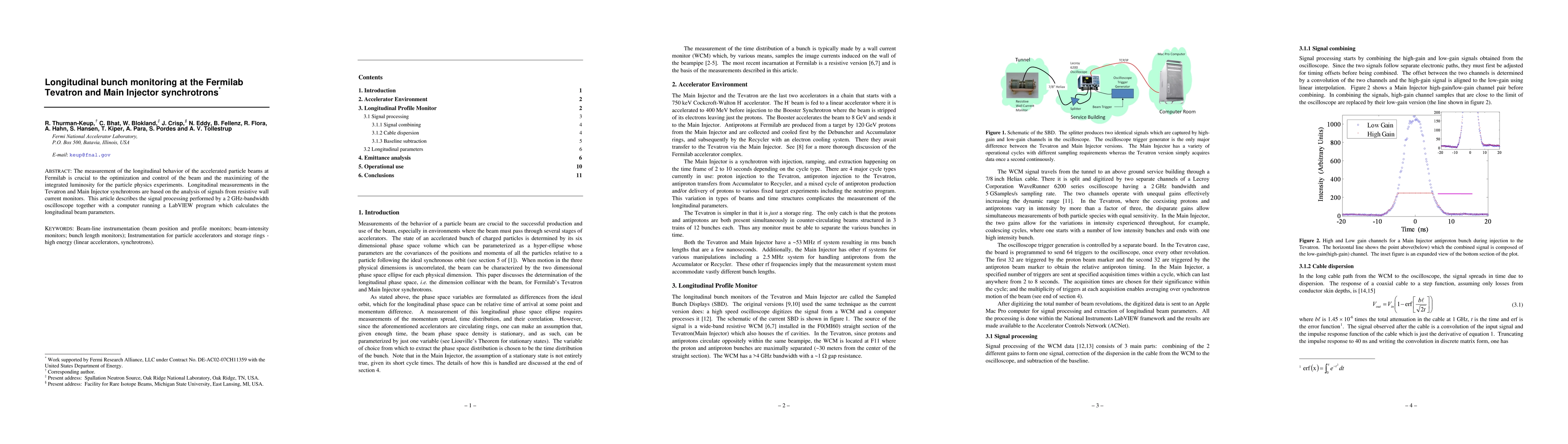 This paper details the longitudinal monitoring techniques used at Fermilab's Tevatron and Main Injector synchrotrons, focusing on the analysis of signals from resistive wall current monitors to optimize beam control and maximize integrated luminosity for particle physics experiments. The study employs a 2 GHz-bandwidth oscilloscope and a LabVIEW program for signal processing and calculation of longitudinal beam parameters.