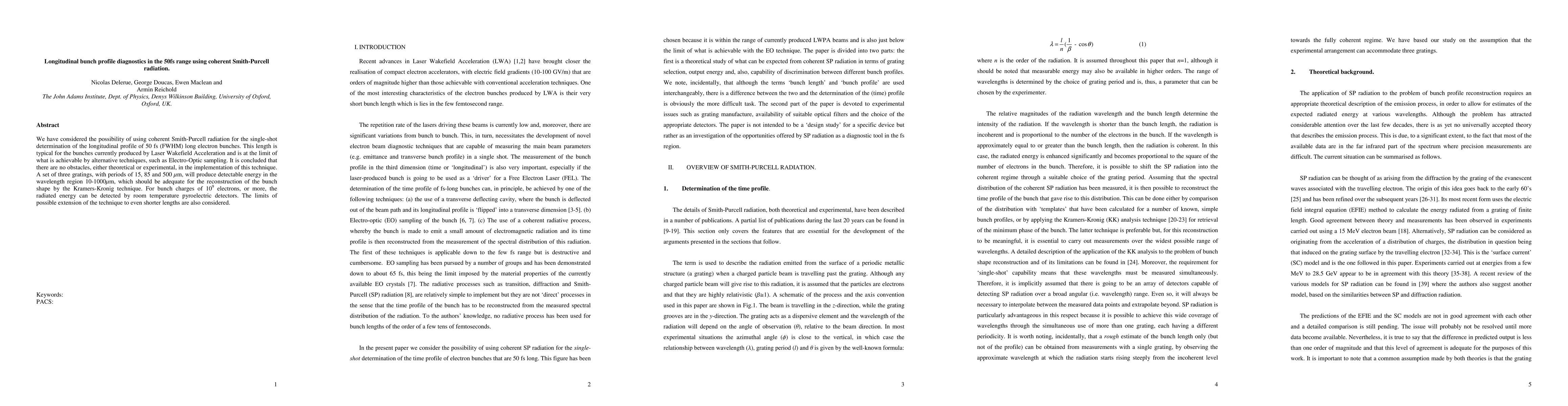 This paper explores the use of coherent Smith-Purcell radiation for real-time diagnostics of 50 fs electron bunches, typical of Laser Wakefield Acceleration, and finds no theoretical or experimental barriers to its implementation. A set of three gratings will produce detectable radiation in the 10-1000 micrometre range, enabling bunch shape reconstruction via the Kramers-Kronig technique.