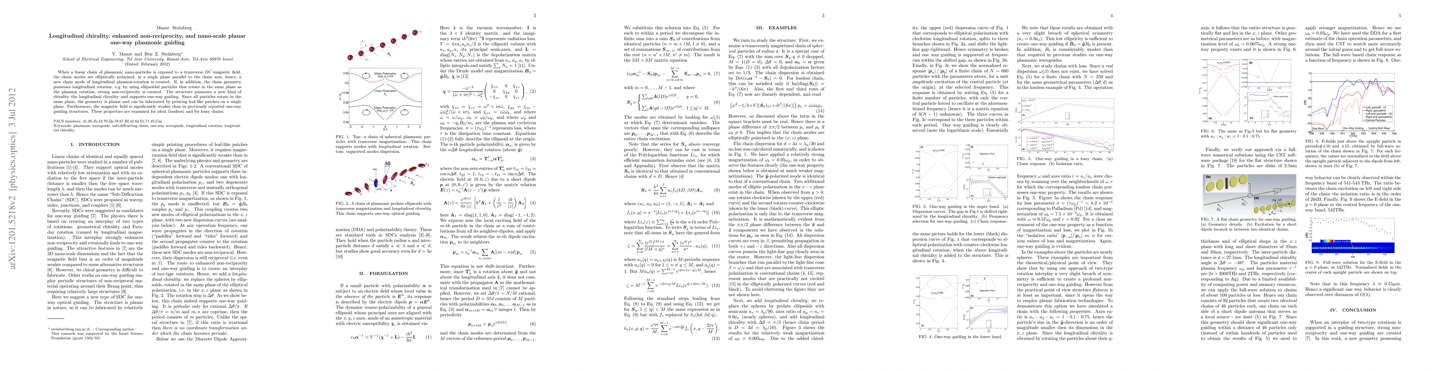 When a linear chain of plasmonic nano-particles is exposed to a transverse DC magnetic field, the chain modes are elliptically polarized, in a single plane parallel to the chain axis; hence, a novel longitudinal plasmon-rotation is created. If, in addition, the chain geometry possesses longitudinal rotation, e.g. by using ellipsoidal particles that rotate in the same plane as the plasmon rotation, strong non-reciprocity is created. The structure possesses a new kind of chirality--the longitudinal chirality--and supports one-way guiding. Since all particles rotate in the same plane, the geometry is planar and can be fabricated by printing leaf-like patches on a single plane. Furthermore, the magnetic field is significantly weaker than in previously reported one-way guiding structures. These properties are examined for ideal (lossless) and for lossy chains.